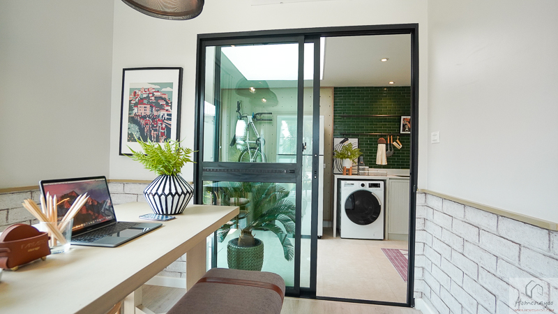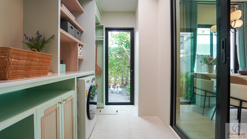 ออกมาที่โซนลานซักล้าง ซึ่งสามารถต่อเติมเป็นครัวปิดได้ตามไลฟ์สไตล์การใช้งาน พื้นที่ส่วนนี้จึงเหมาะทั้งงานซักล้างหรือทำครัวไทยที่ต้องการแยกกลิ่นและควันออกจากตัวบ้าน