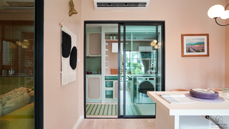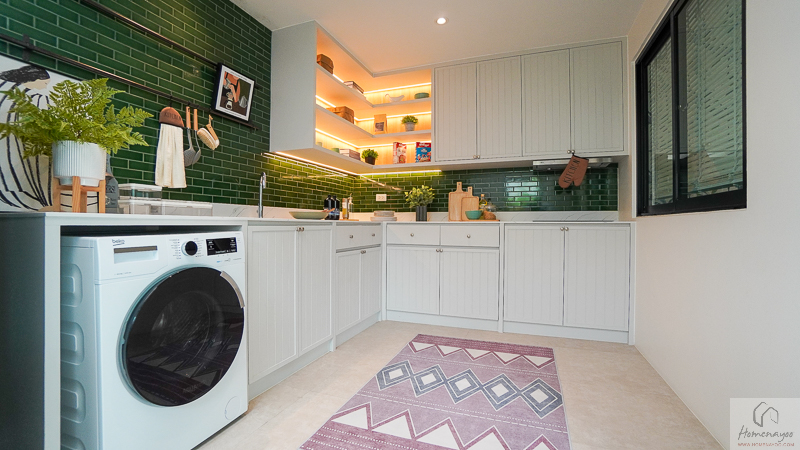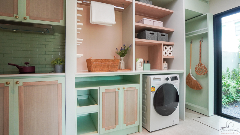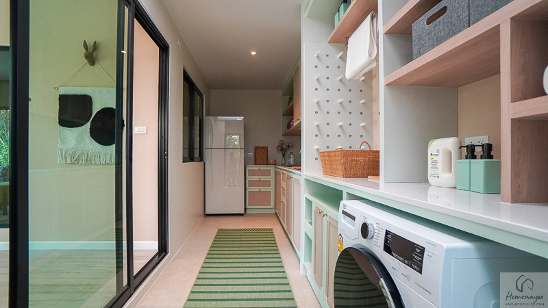 ส่วนอีกด้านแบ่งเป็นมุมซัก-อบผ้า ติดตั้งราวแขวนและชั้นวางของให้ดูเป็นตัวอย่าง ช่วยให้พื้นที่หลังบ้านใช้งานได้ครบทั้งครัวและงานซักล้างในโซนเดียวกันอย่างลงตัว