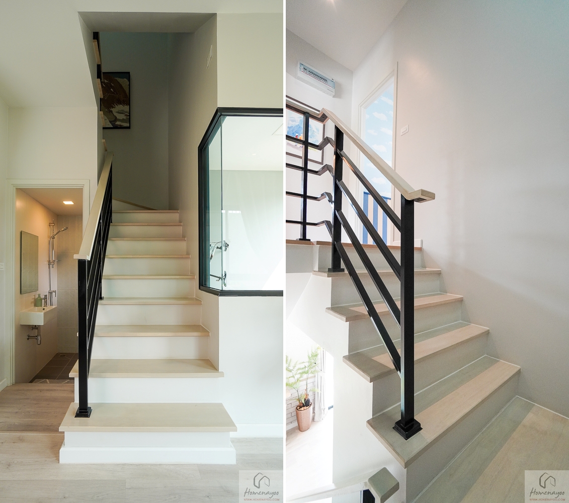 บันไดโครงสร้างคอนกรีตเสริมเหล็ก ลูกนอนไม้ยางพาราประสานสีอ่อน ติดราวจับสีดำกันสนิมต่อเนื่องไปจนถึงชั้น 2