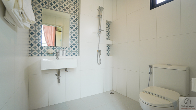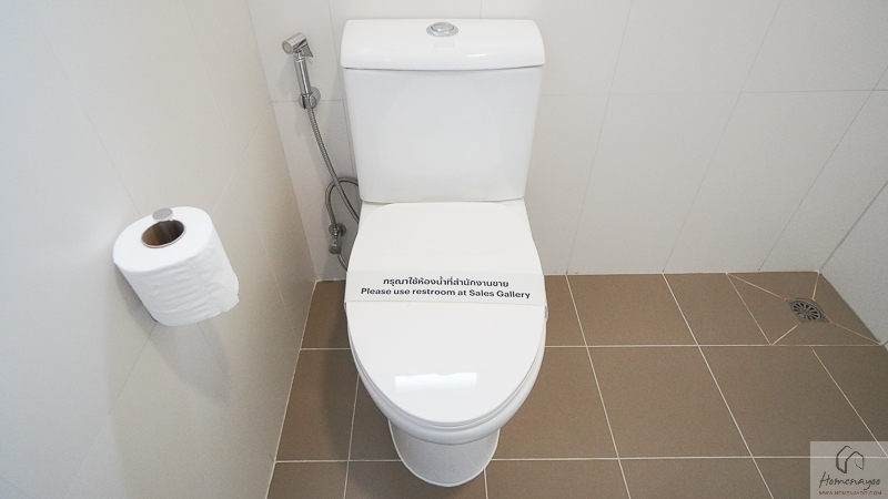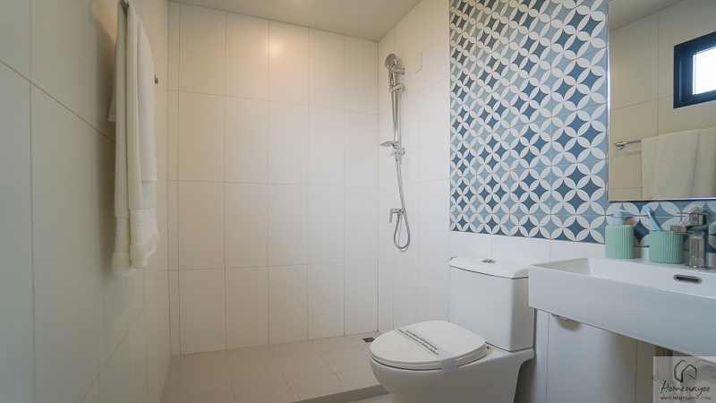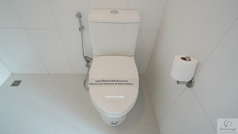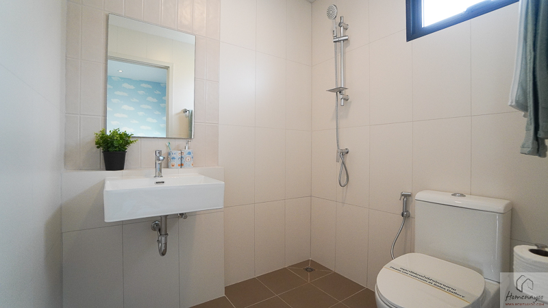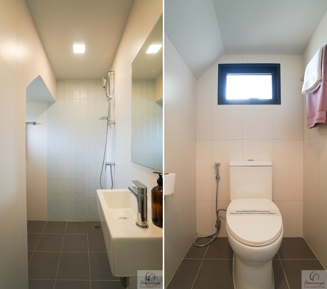ภายในได้พื้นที่ใช้งานมากว้างกำลังดี แต่งกระเบื้องโทนสีอ่อนมาเหมือนเดิม และติดตั้งสุขภัณฑ์มาตรฐานมาให้ครบค่ะ