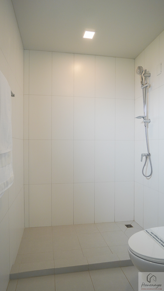 ส่วนอาบน้ำเข้ามุมห้อง ใช้งานได้สะดวก พร้อมติดฝักบัว Hand Shower ที่มีราวปรับระดับ ที่วางสบู่ และที่ผนังจะมีการเจาะช่องทำชั้นวางของ รวมถึงติด Junction Box มาให้พร้อมต่อใช้งานค่ะ