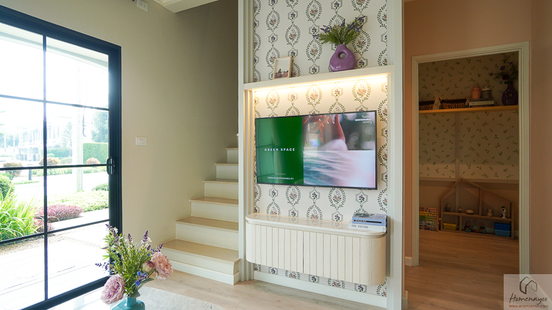 มุมนี้เหมาะสำหรับวางชั้นทีวีขนาดประมาณ 1 ม. กำลังพอดีกับสัดส่วนพื้นที่ หรือใครอยากเพิ่มความเรียบร้อย ก็สามารถ Built-in เป็นตู้เก็บของและชั้นวางเต็มผนัง แล้วติดตั้ง Smart TV ไว้ตรงกลางได้เช่นกัน