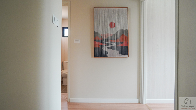 ขึ้นมาที่ชั้น 2 จตะเจอกับโถงบ้านที่ใช้แยกไปยังห้องต่าง ๆ ความสูงฝ้าเพดานชั้นบนจะอยู่ที่ 2.9 ม. และได้พื้นเป็นลามิเนตลายไม้สีอ่อน หนา 8 มม.