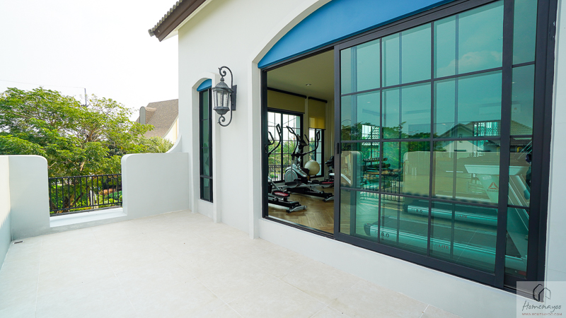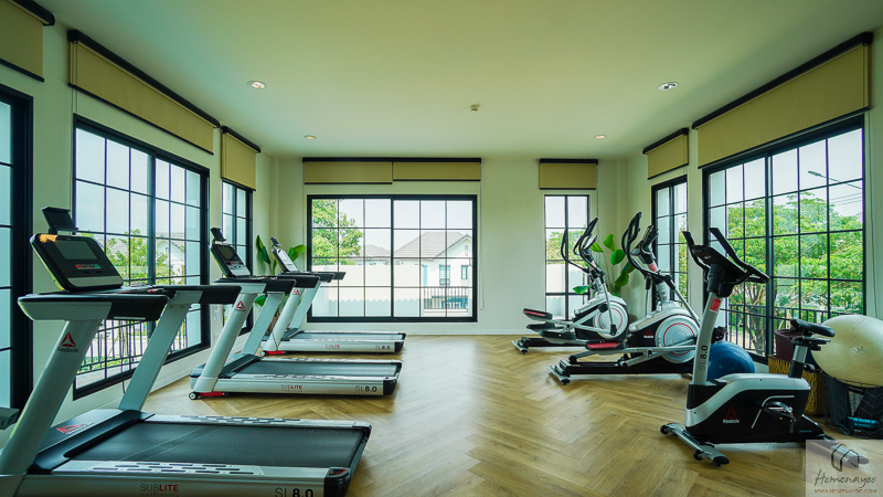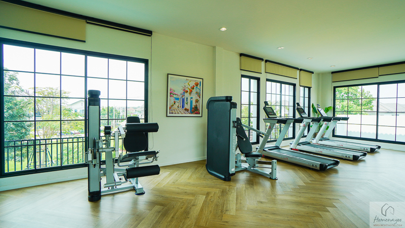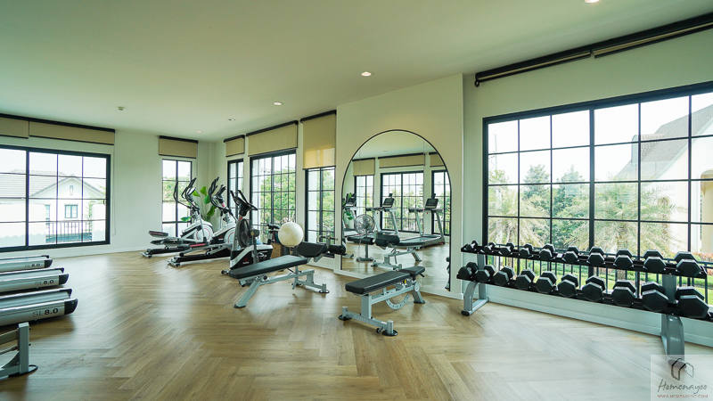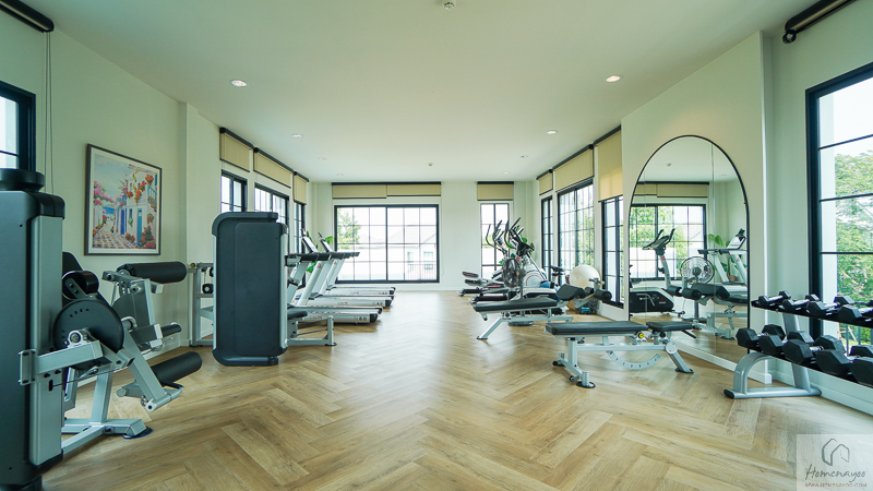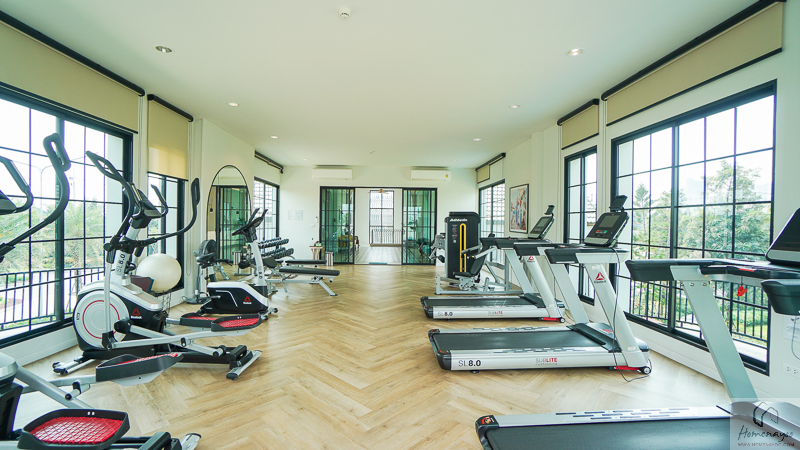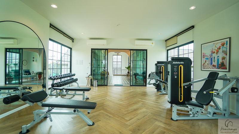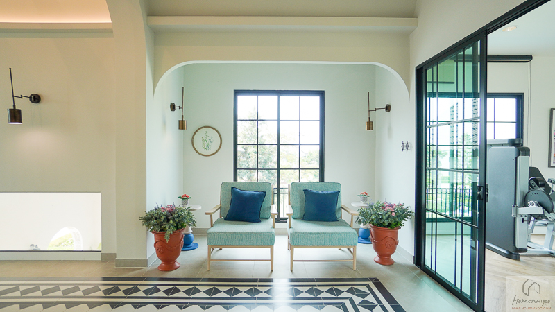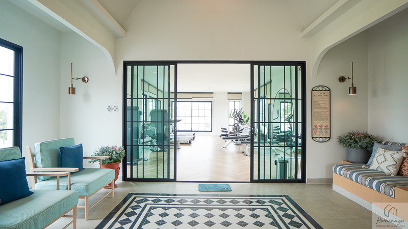ภายในมีสระว่ายน้ำระบบเกลือ แยกสระเด็กและผู้ใหญ่ให้ใช้งานเป็นสัดส่วน โซนพักผ่อนในอาคารก็จัดไว้หลายมุม จะนั่งเล่น อ่านหนังสือ หรือใช้เป็นพื้นที่รับรองแขกก็สะดวก โดยไม่ต้องพาใครเข้าไปถึงตัวบ้าน ขยับมาอีกฝั่งเป็น Fitness ขนาดใหญ่ เครื่องออกกำลังกายทันสมัยครบทั้ง Cardio, Weight Training และ Yoga รวมถึง Kids Room สำหรับเด็ก ๆ ทำให้ทุกคนในครอบครัวมีพื้นที่ของตัวเองอย่างแท้จริง