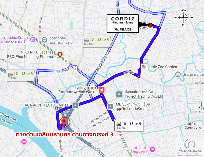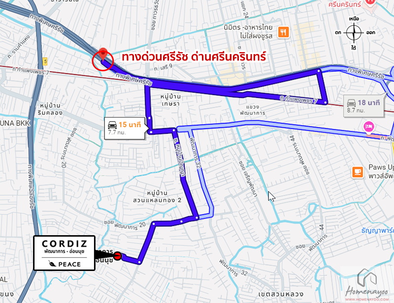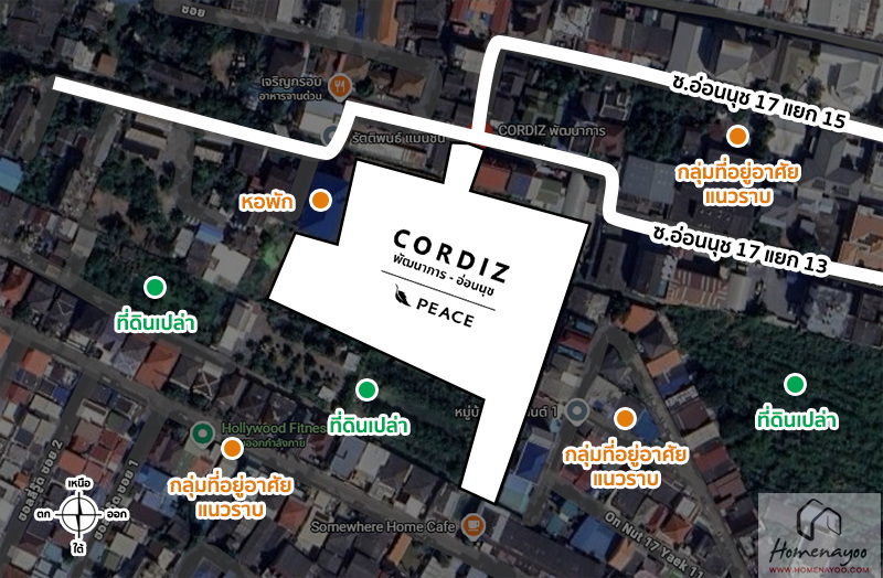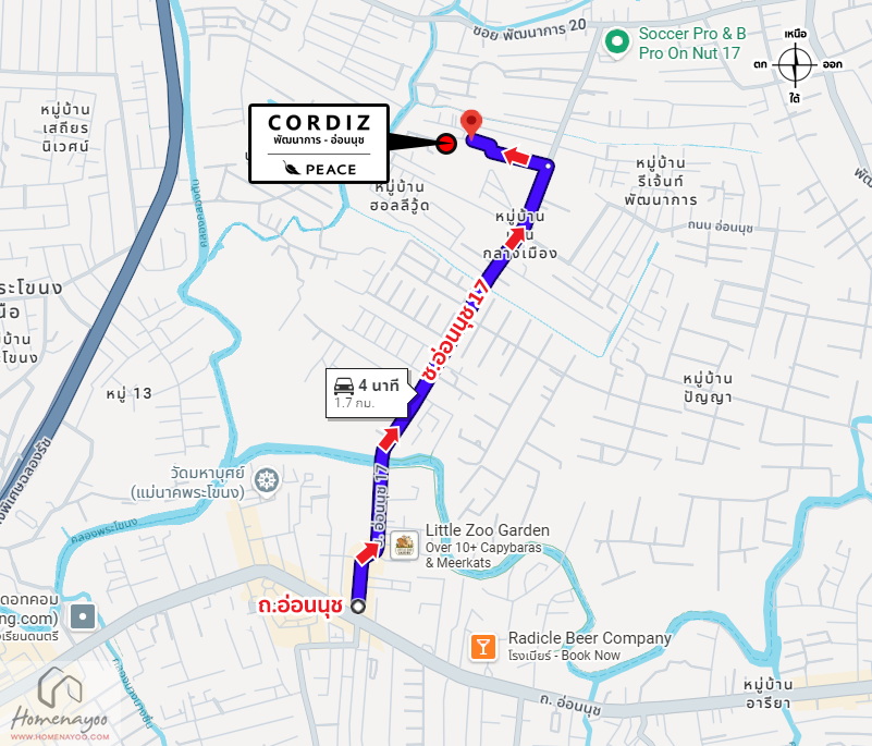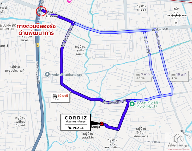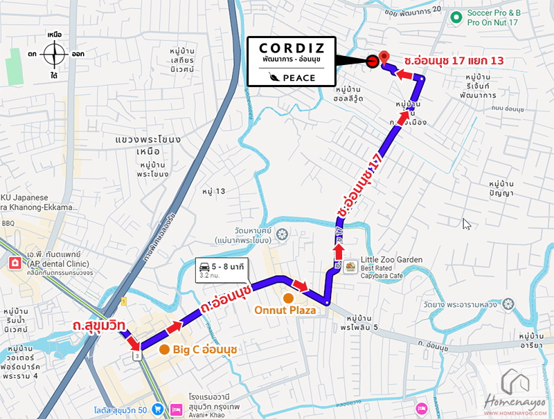 เริ่มจากถนนสุขุมวิท ⇒ ถนนอ่อนนุช ⇒ ซอยอ่อนนุช 17 ⇒ ซอยอ่อนนุช 17 แยก 13 ⇒ ถึงโครงการ CORDIZ พัฒนาการ-อ่อนนุช ทางฝั่งซ้ายมือ