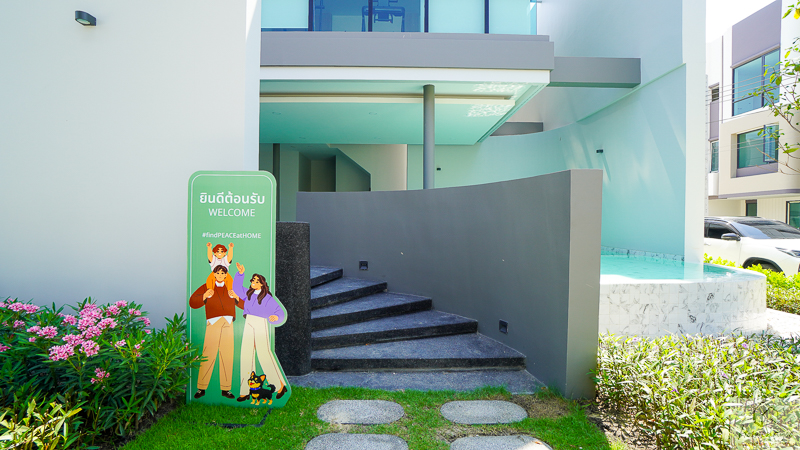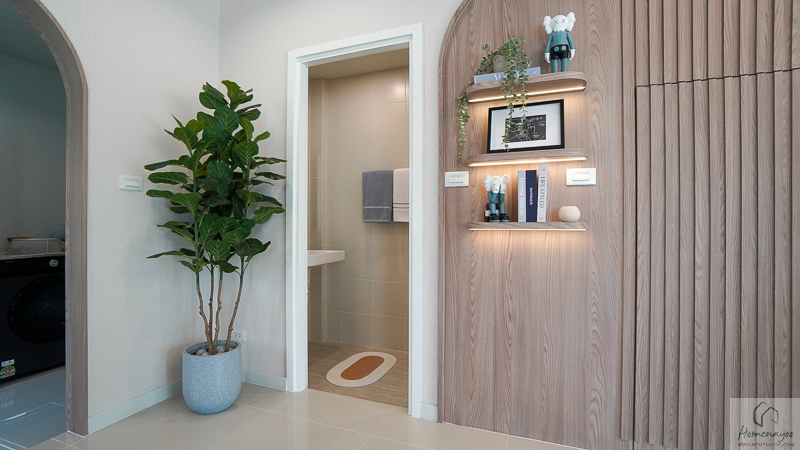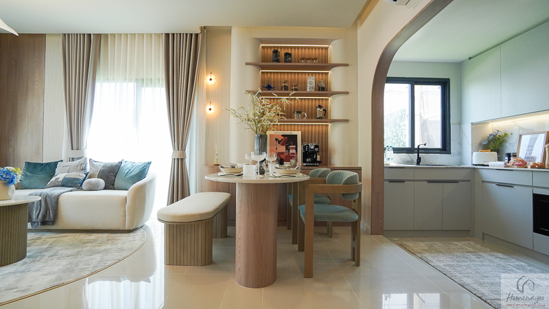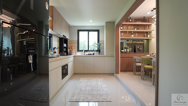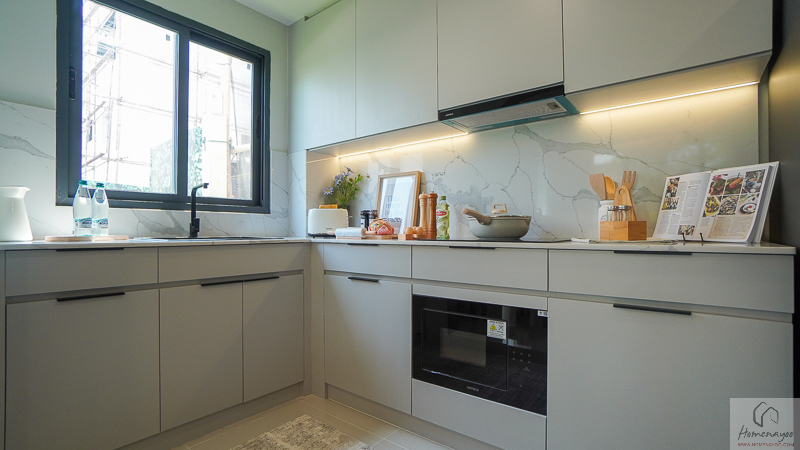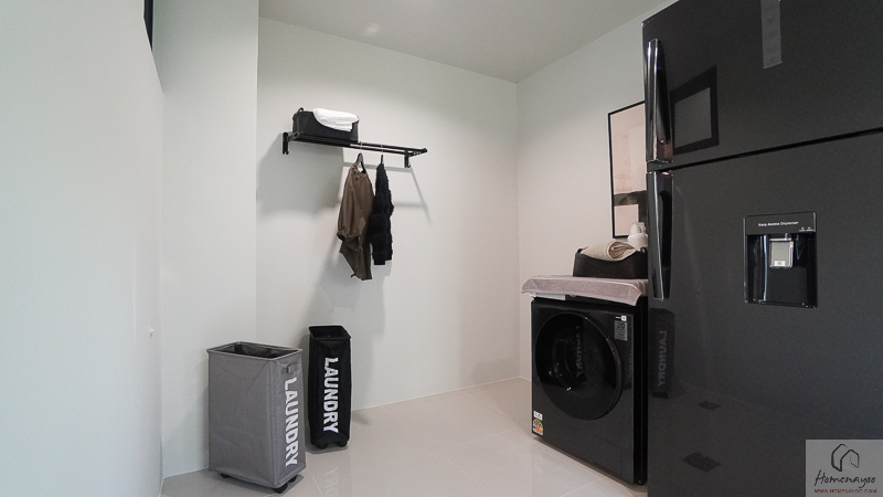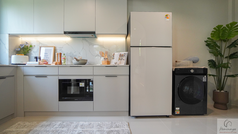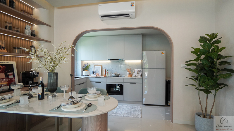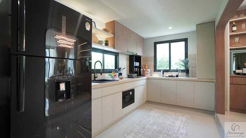 ในบ้านตัวอย่างตกแต่งมาในรูปแบบ Full Function ให้เห็นภาพการใช้งานครบทั้งเคาน์เตอร์เตรียมอาหาร ตู้เก็บของ และพื้นที่วางเครื่องใช้ไฟฟ้า อย่างตู้เย็นและเครื่องซักผ้า เพื่อเป็นไอเดียสำหรับการออกแบบต่อยอด