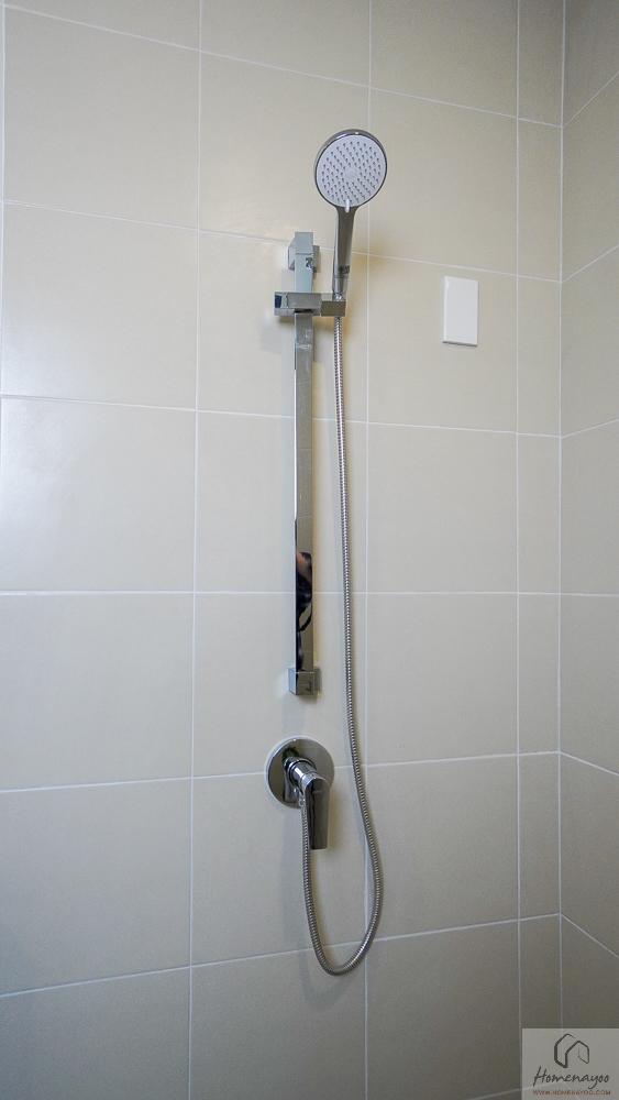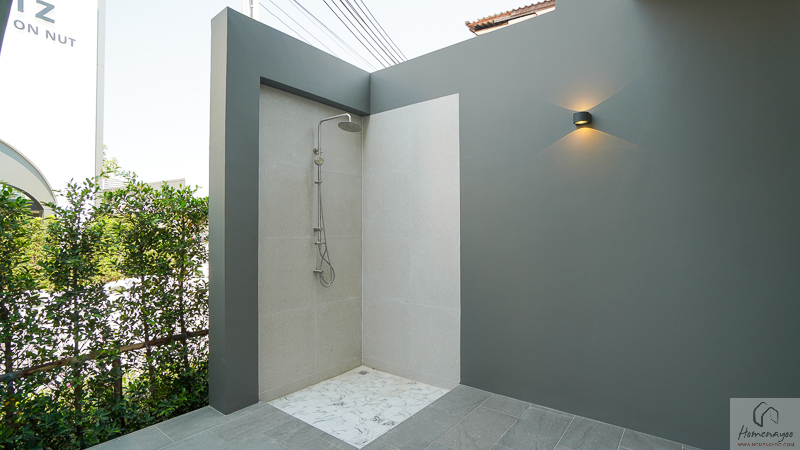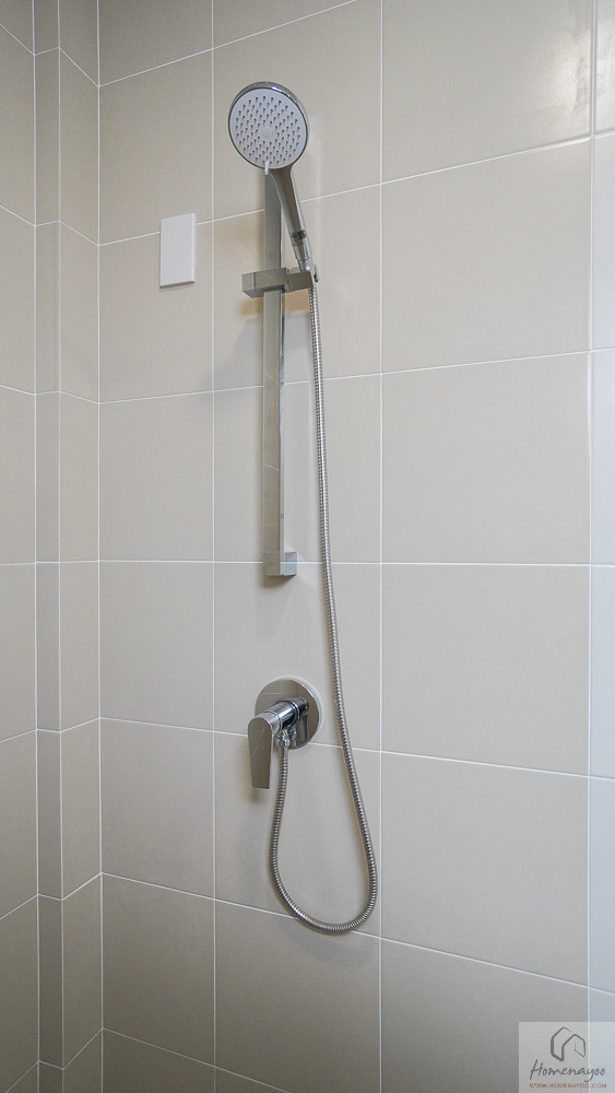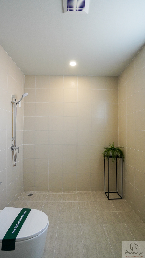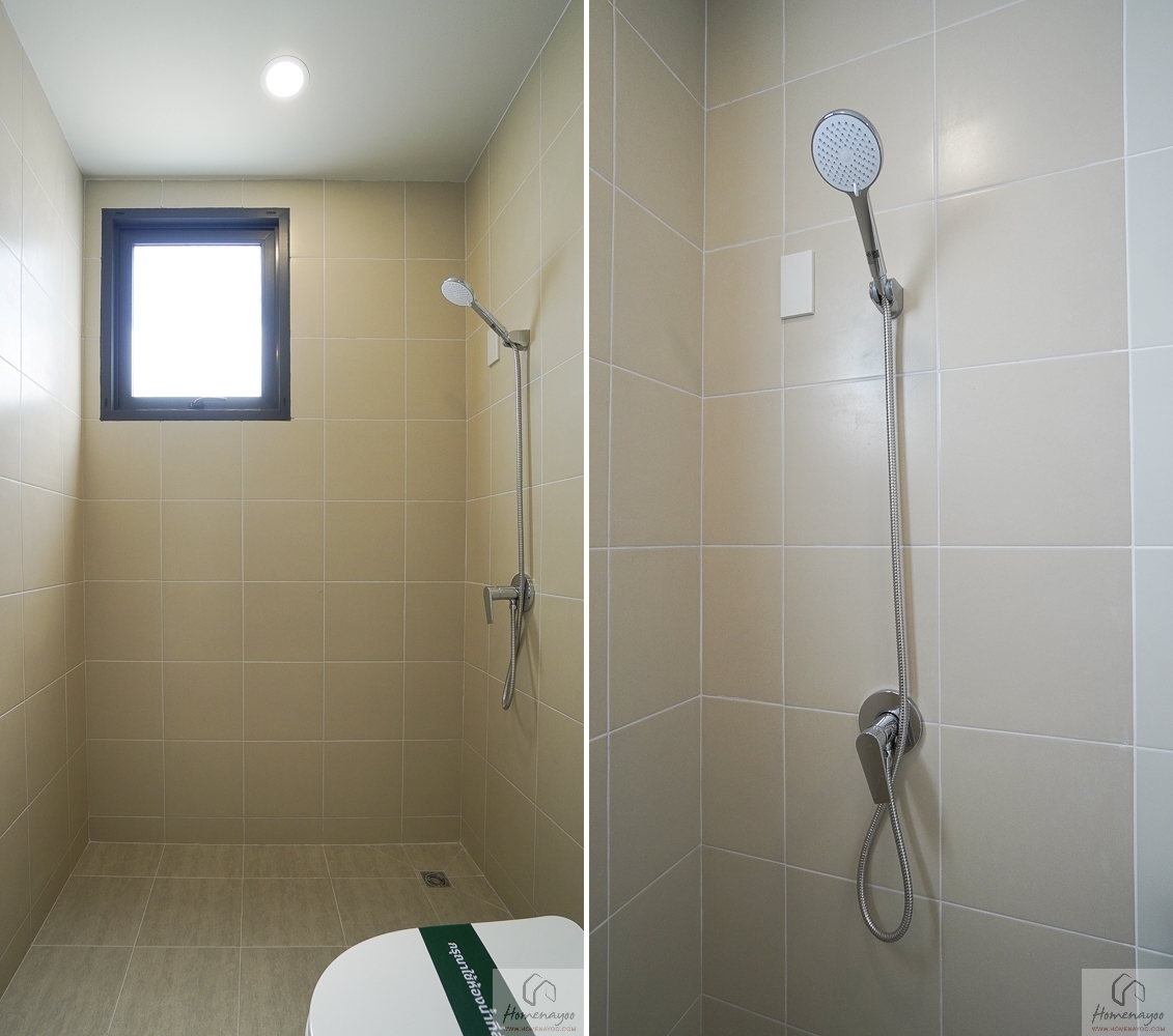 อีกฝั่งเป็นส่วนอาบน้ำ พื้นที่ใช้งานกว้าง อาบน้ำได้สะดวก และตัวพื้นจะมีการลดระดับลงไปให้เล็กน้อย พร้อมติดตั้งฝักบัวและ Junction Box มาให้ครบ