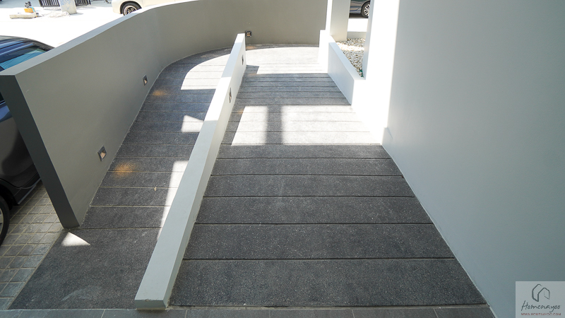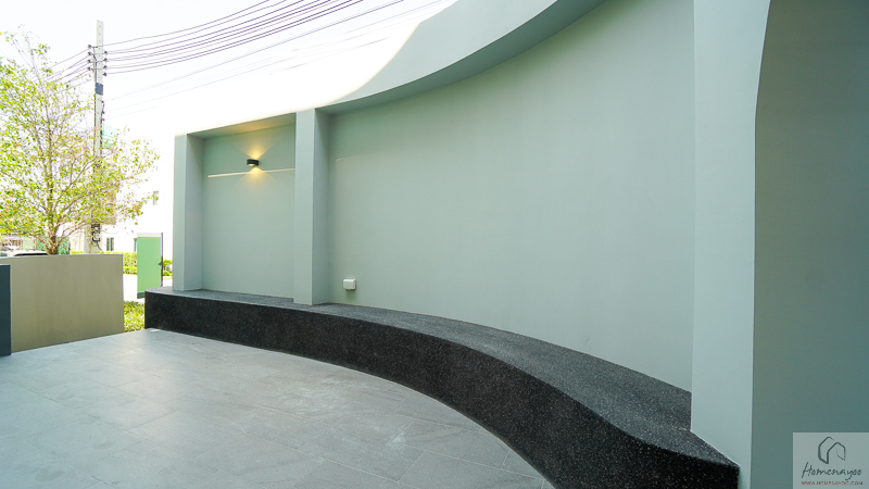 บริเวณ Facade ด้านหน้าออกแบบผนังแบบเล่นระดับตื้น-ลึก ช่วยสร้างมิติและเพิ่มรายละเอียดให้ตัวบ้านดูมีลูกเล่นมากขึ้น ไม่เรียบแบนจนเกินไป เมื่อมองจากภายนอกจึงให้ความรู้สึกโดดเด่นอย่างมีสไตล์