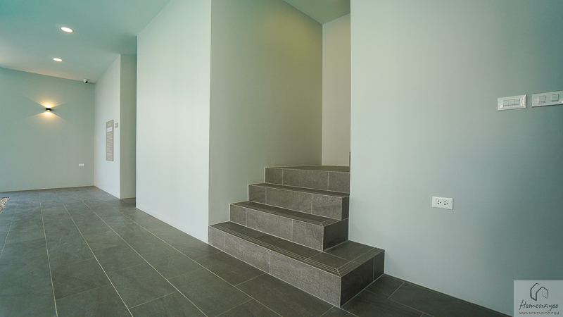 เข้ามาภายในบ้านจะเจอกับ Common Area แบบ Open Plan ความสูงพื้น-ฝ้าเพดานจะอยู่ที่ 2.6 ม. พื้นบ้านชั้นล่างปูแกรนิตโต้สีเบจ 60 x 60 ซม. ผนังบ้านและฝ้าเพดานเป็นแบบฉาบเรียบทาสี พร้อมติดโคมไฟ Downlight หลอด LED ให้ทั้งหลัง