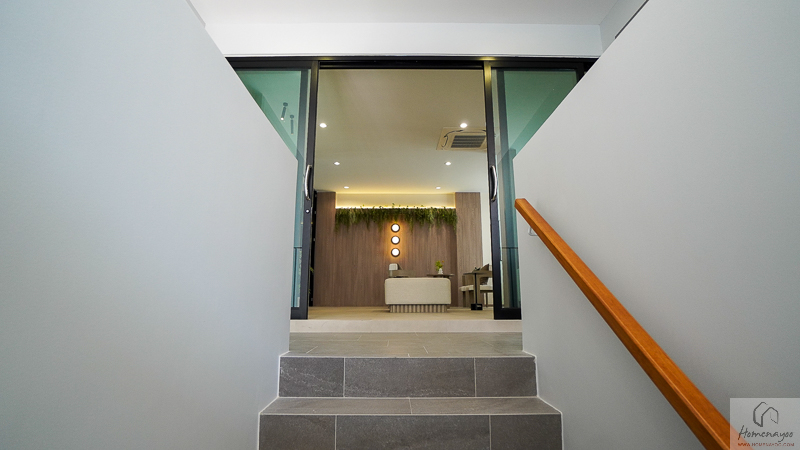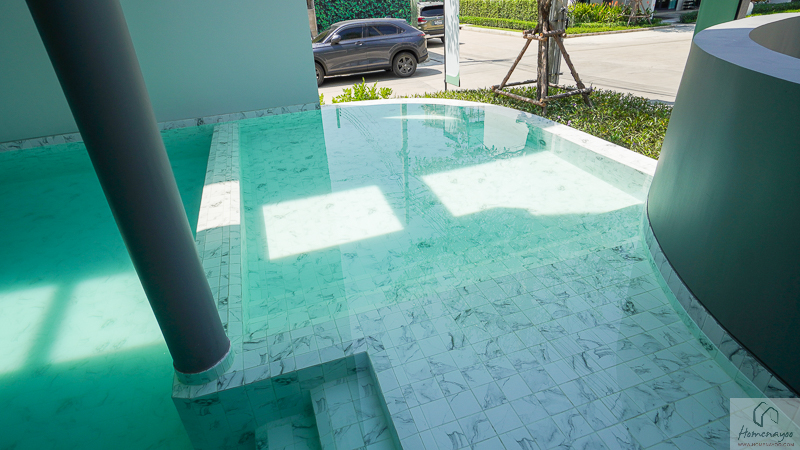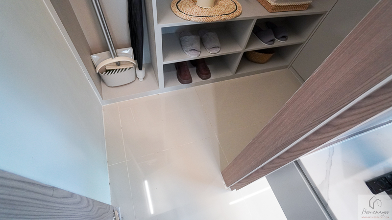 ถัดเข้าไปด้านในจะมีเฉลียงหน้าบ้านที่ยกพื้นขึ้นมาให้ 1 Step รองรับการวางชั้นวางรองเท้า ม้านั่งใส่รองเท้าเล็ก ๆ ตะกร้าใส่ร่ม หรือวางของตกแต่งบ้านน่ารัก ๆ เพิ่มได้