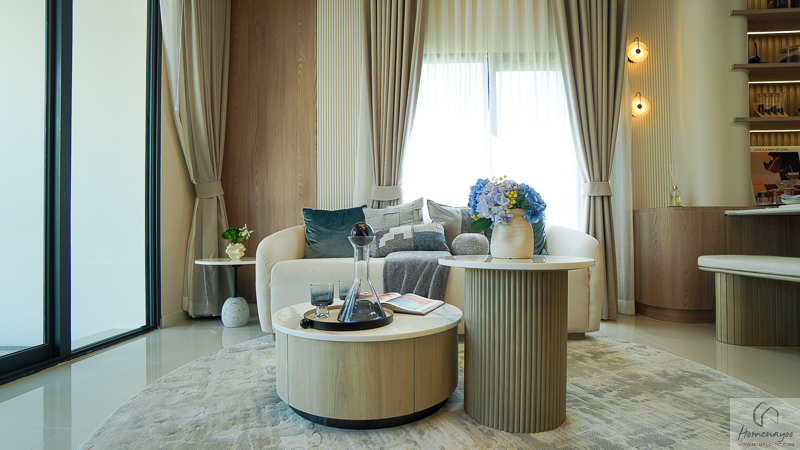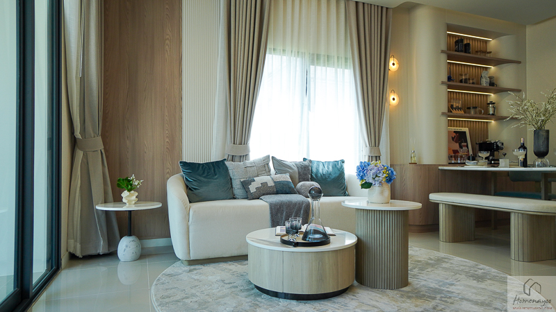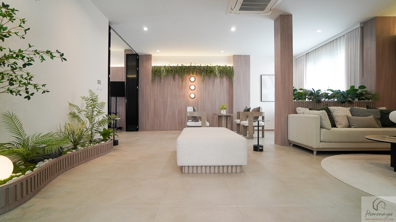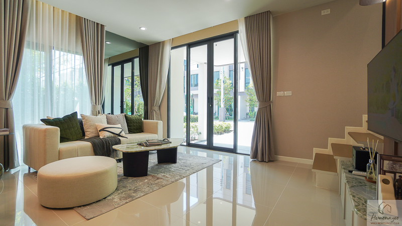 หน้าบ้านจัดฟังก์ชันเป็นห้องนั่งเล่น พื้นที่ใช้งานสามารถวางโซฟาเซ็ตใหญ่ 3-5 ที่นั่ง พร้อมโต๊ะกลางด้านหน้าได้ และมีระยะใช้งานตรงกลางที่กว้างเป็นพิเศษ