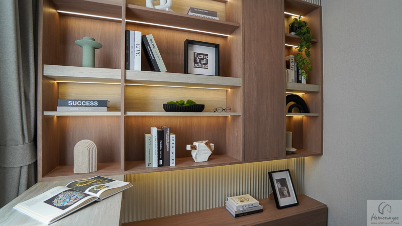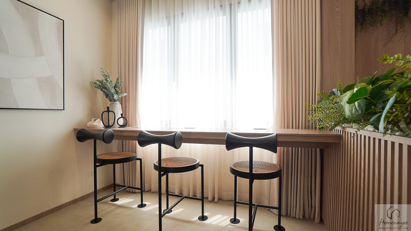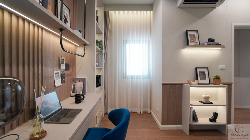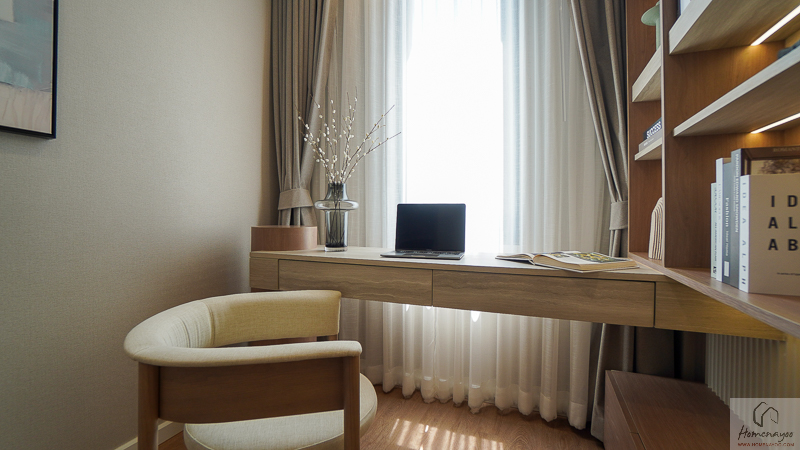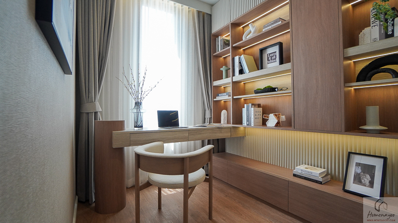 ไอเดียการตกแต่งจะ Built-in โต๊ทำงานแบบ 1 ที่นั่งหลวม ๆ ไว้ติดกับหน้าต่างกระจกบานใหญ่ฝั่งหน้าบ้าน เพื่อให้มีแสงสว่างที่เพียงพอต่อการใช้งาน และอีกด้านทำเป็นชั้นวางหนังสือ วางของตกแต่งบ้านได้เต็มพื้นที่
