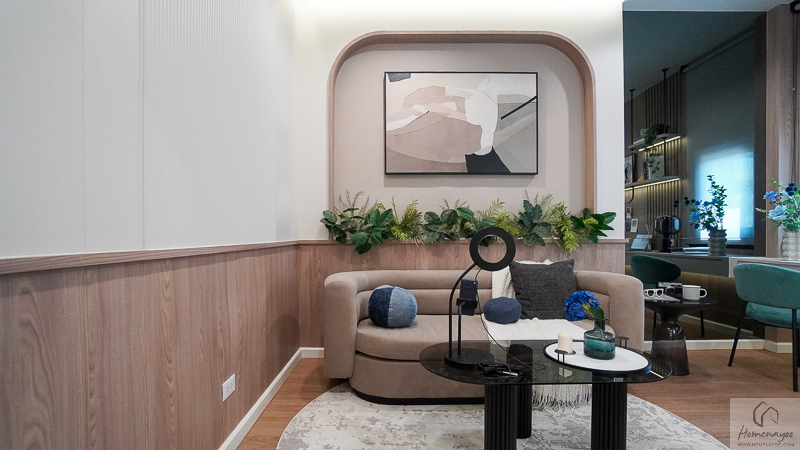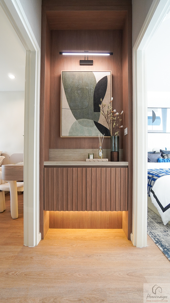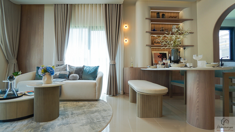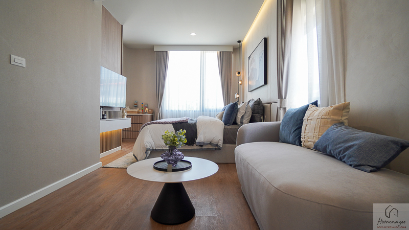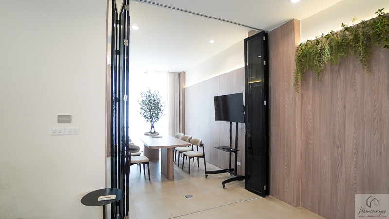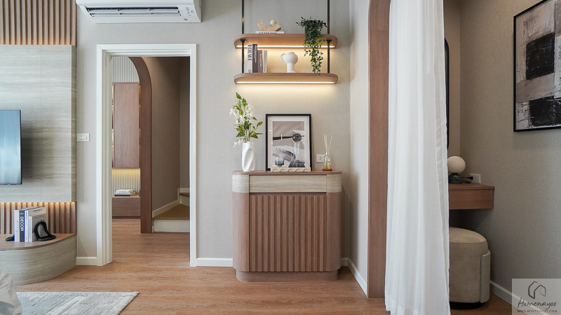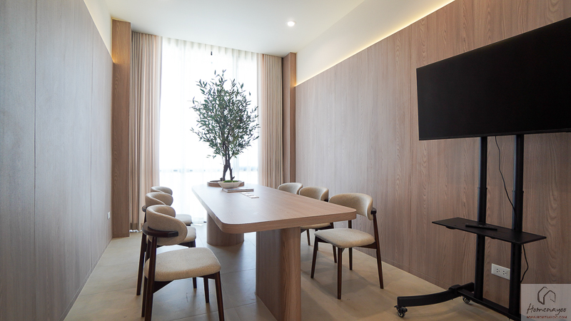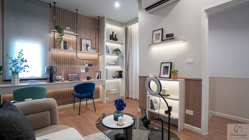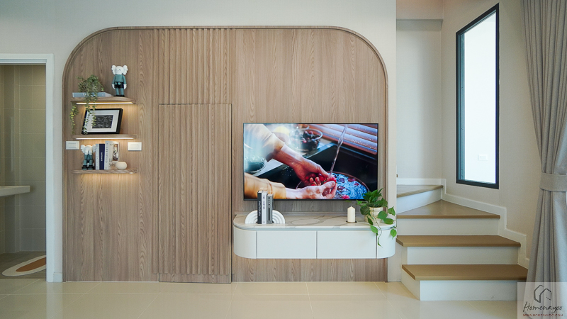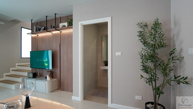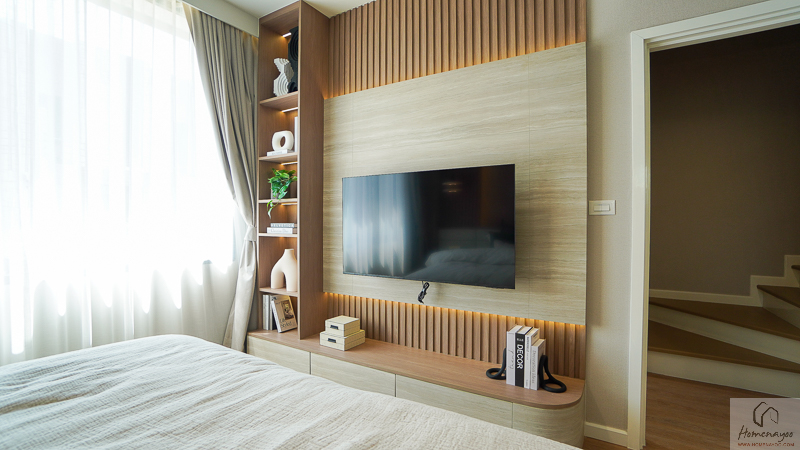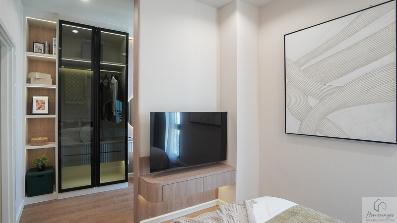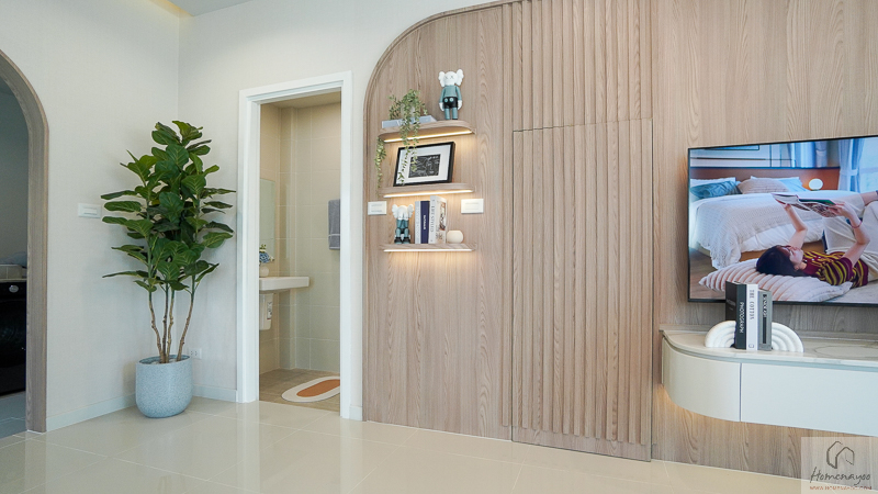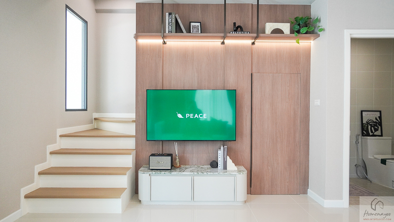 ตรงข้ามกันจะมีพื้นที่ให้วางชั้นวางทีวี หรือจะติด Smart TV จอใหญ่ 50-55 นิ้วได้เลย โดยที่ผนังด้านหลังจะมีการเตรียมงานระบบต่าง ๆ ไว้ให้พร้อมต่อใช้งาน