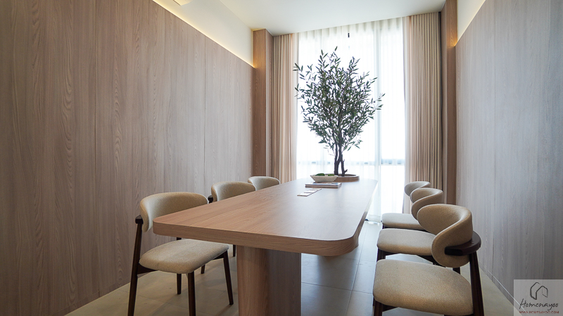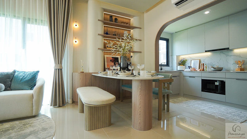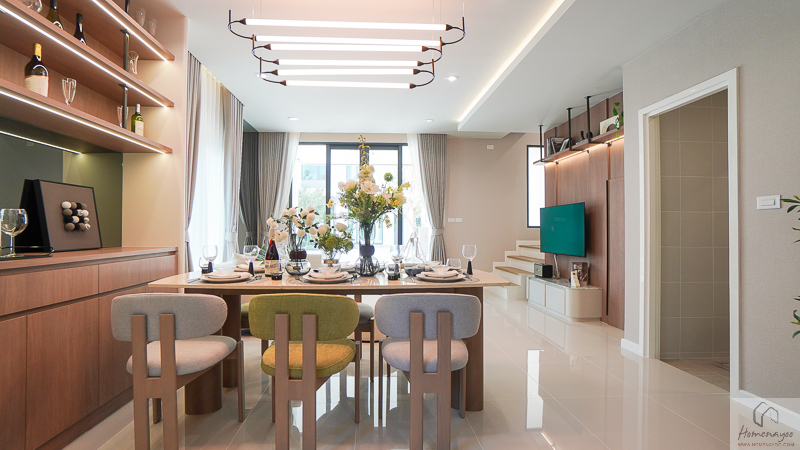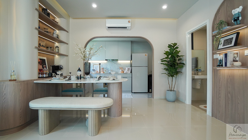 สามารถวางชุดโต๊ะทานข้าวขนาด 4-6 ที่นั่ง แล้วเสริมด้วย Pantry สำหรับอุ่นอาหารง่าย ๆ หรือจะทำเป็น Mini Bar ไว้ด้านข้างได้ด้วยค่ะ