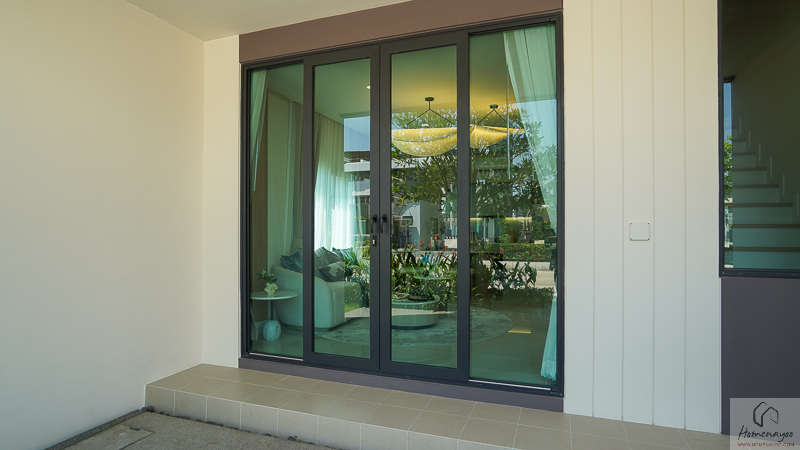 ประตูทางเข้าบ้านเลือกใช้บานลูกฟักกระจกเขียวตัดแสง ช่วยลดความร้อนและกรองแสงได้ดี พร้อมกรอบอะลูมิเนียม Powder Coat สีเทาผิว Sahara ที่ให้สัมผัสด้าน ดูเรียบหรูและทันสมัย ตัวบานเป็นแบบเลื่อนเปิดจากกึ่งกลาง ใช้งานสะดวกและช่วยประหยัดพื้นที่บริเวณทางเข้า