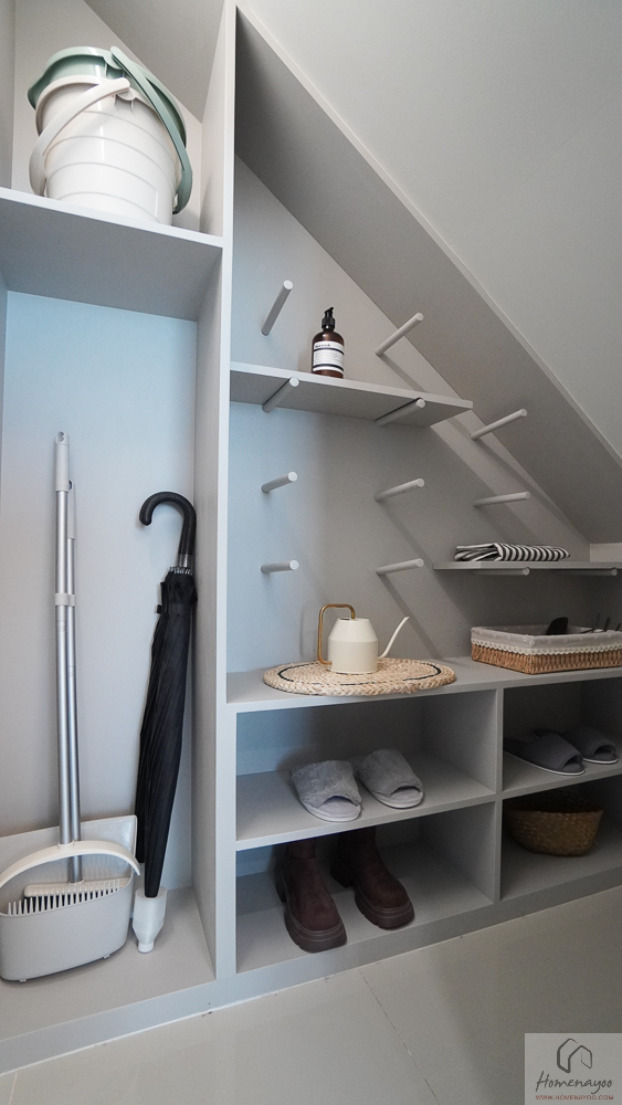 ด้านข้างพื้นที่วางทีวี จะมีห้องเก็บของขนาดใหญ่ให้ 1 ห้อง ตำแหน่งอยู่ใต้โถงบันได ทำให้ได้ห้องที่เพดานสูง เปิดเข้า-ออกหยิบเก็บของได้ง่าย และมีการติดโคมไฟให้แสงสว่างไว้ 1 ดวง