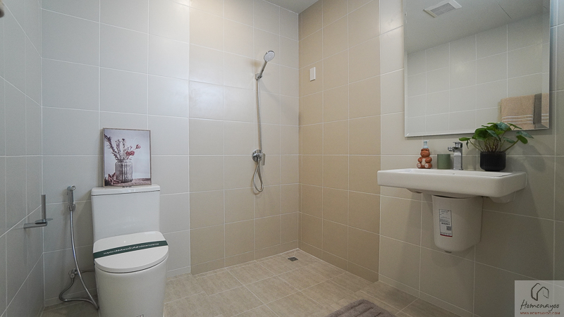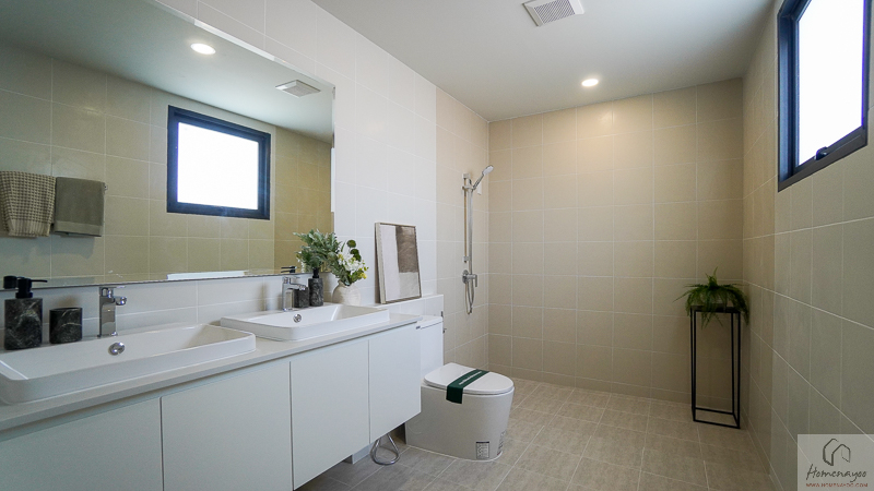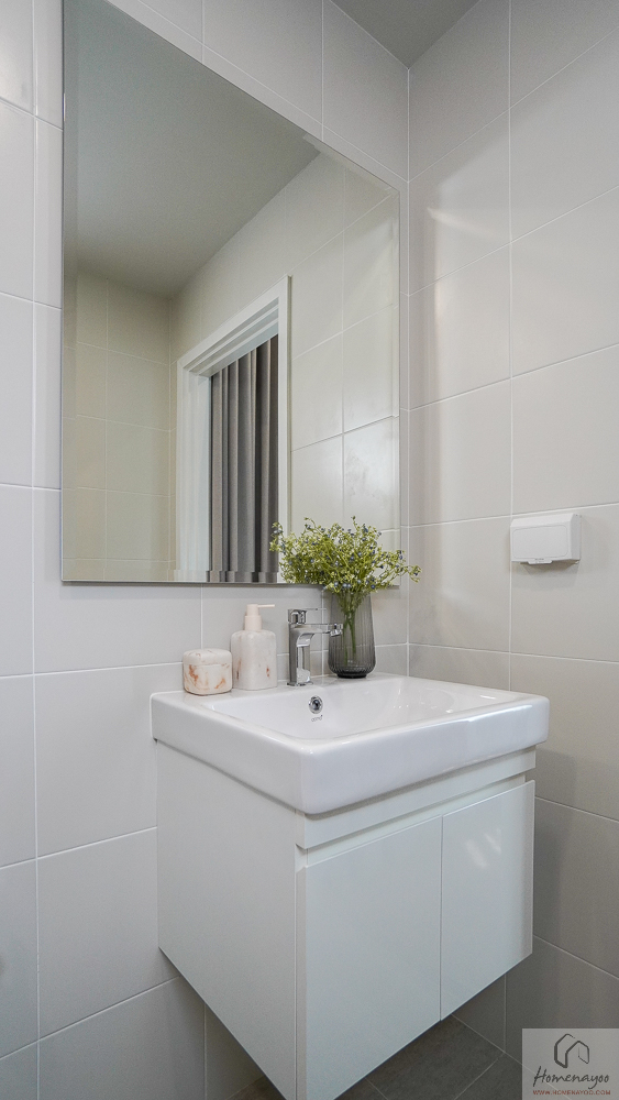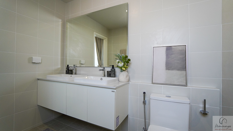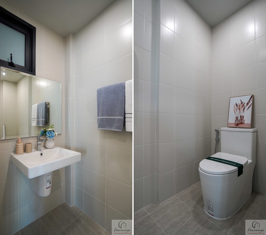 ภายในห้องน้ำถูกออกแบบในแนวคิด His & Her ใช้งานได้พร้อมกันอย่างเป็นสัดส่วน ผนังและพื้นกรุกระเบื้องโทนสว่าง ให้บรรยากาศเรียบหรู ดูสะอาดตา
