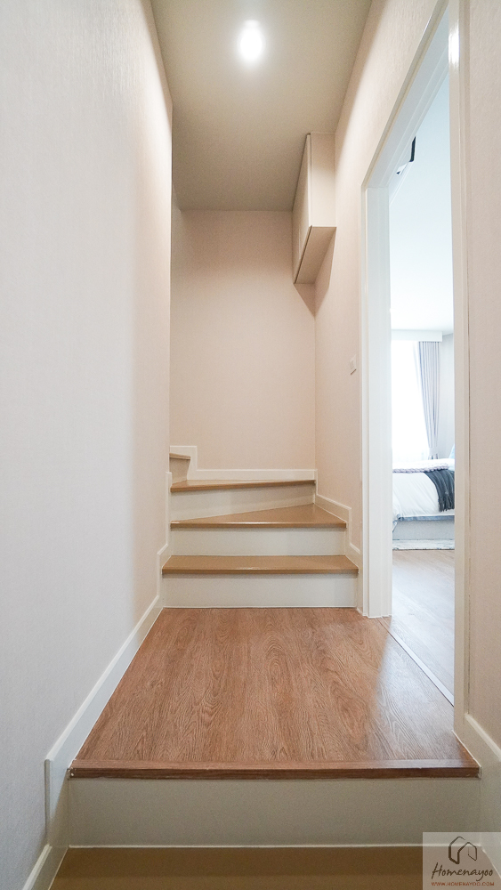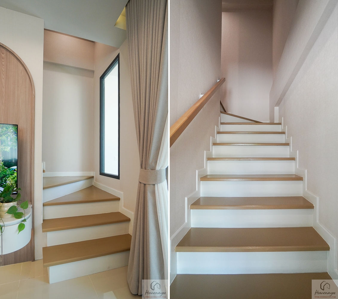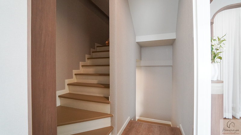 อีกฝั่งของบ้านจัดวางโถงบันไดอย่างเป็นสัดส่วน พร้อมห้องเก็บของใต้บันไดสำหรับจัดเก็บสัมภาระให้บ้านเป็นระเบียบ และมีห้องน้ำชั้นล่างแบบ Powder Room อยู่บริเวณด้านหลัง ใช้งานสะดวกสำหรับแขกและสมาชิกในบ้าน
