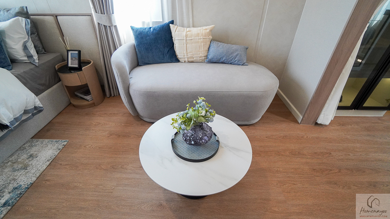 โซนแรกจัดวางโซฟา Love Seat พร้อมโต๊ะกลาง และชั้นวางของที่ฝั่งตรงข้ามมาให้ดูระยะใช้งาน บ้านจริงเลือกวางเป็นโซฟา L-Shape ไว้เอนหนัง นั่งดูหนังสบาย ๆ ได้