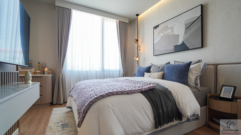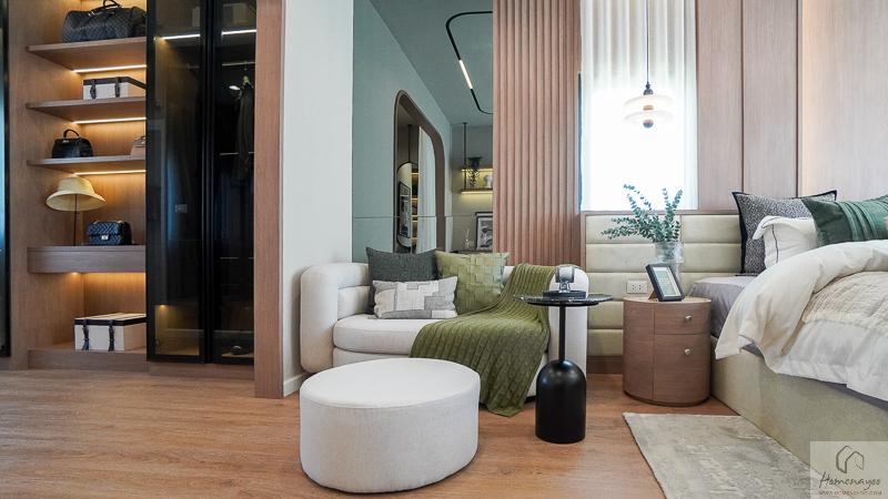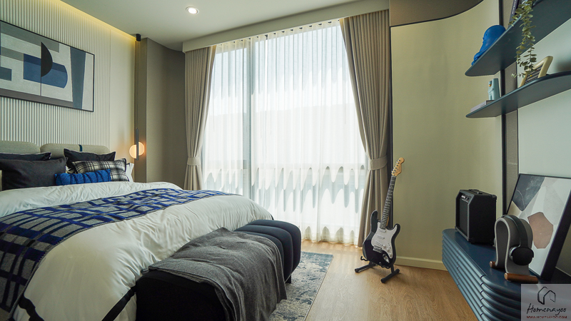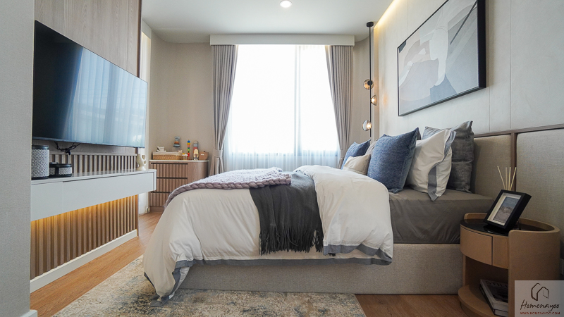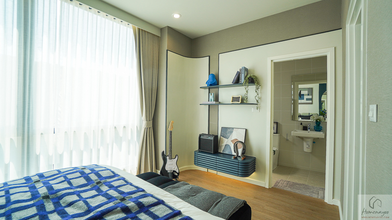 Master Bedroom ให้ความรู้สึกเหมือนมี Penthouse ส่วนตัว สามารถแยกโซนวางเตียง มุมชั้นวางทีวี และพื้นที่แต่งตัวออกจากกันได้ชัดเจน ทำให้ภาพรวมของห้องดูโปร่ง โล่ง และใช้งานได้สะดวกในชีวิตประจำวัน ทั้งในแง่การพักผ่อนและการแต่งตัวเตรียมตัวออกจากบ้านค่ะ