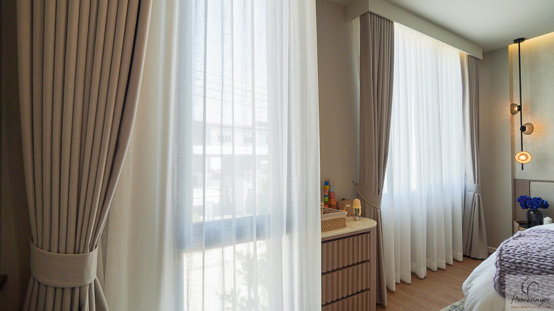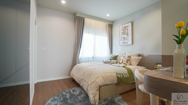 ถัดมาจะเป็นห้องนอนรองฝั่งหน้าบ้าน ซึ่งบ้านตัวอย่างจัดเป็นห้องนอนรองแบบหน้ากว้างเต็มพื้นที่มาให้ดูเป็นไอเดีย โดยห้องนี้จะได้หน้าต่างกระจกบานผสมแนวสูงมาด้วย 2 บานค่ะ