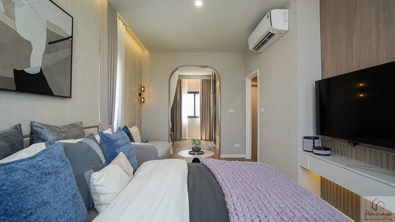 ถัดมาทางหน้าบ้าน จัดวางเตียงนอน King Size พร้อมม้านั่งปลายเตียง และชั้นวางทีวีไว้อีกฝั่งให้ดูระยะใช้งานจริง รอบเตียงยังเหลือพื้นที่เดินได้สะดวก ไม่อึดอัด ทำให้การจัดวางเฟอร์นิเจอร์ชิ้นใหญ่ทำได้สบาย และใช้งานได้คล่องตัวในทุกวัน