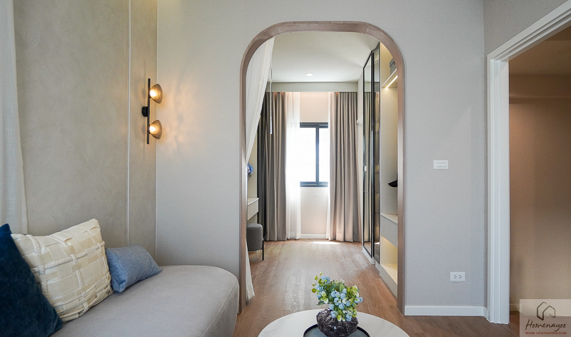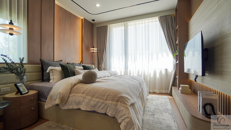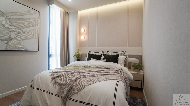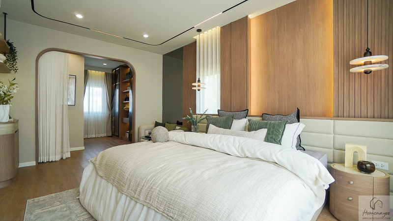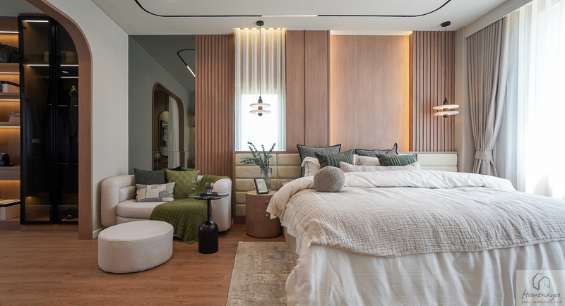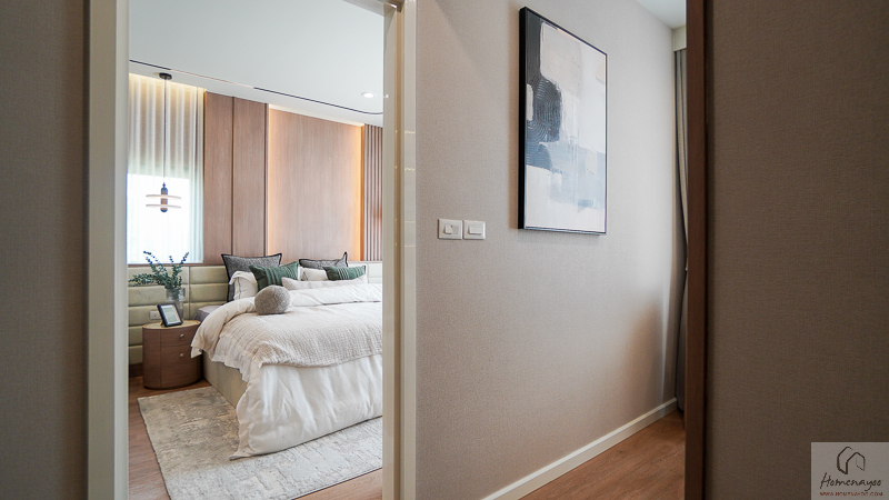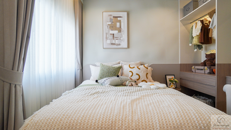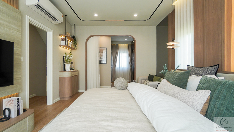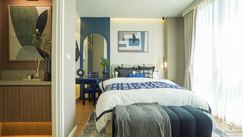 บริเวณด้านในข้างเตียงมีการเว้นพื้นที่ลึกเป็นสัดส่วน สามารถจัดวางตู้เสื้อผ้าและโต๊ะเครื่องแป้งได้อย่างลงตัว ช่วยให้การใช้งานสะดวกและเป็นระเบียบมากยิ่งขึ้น