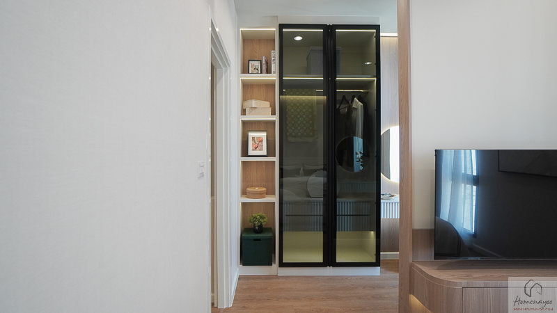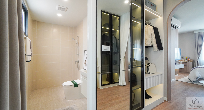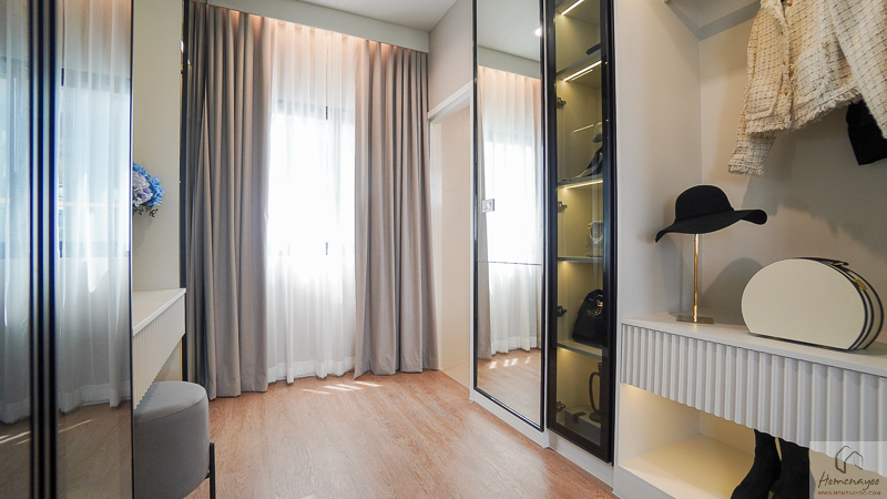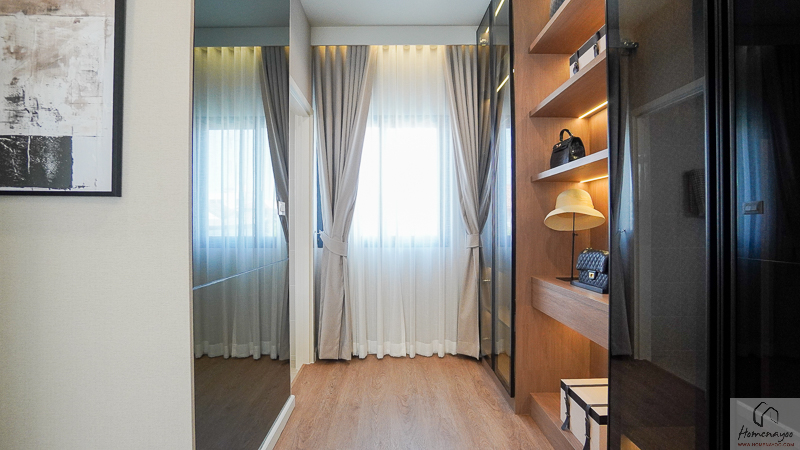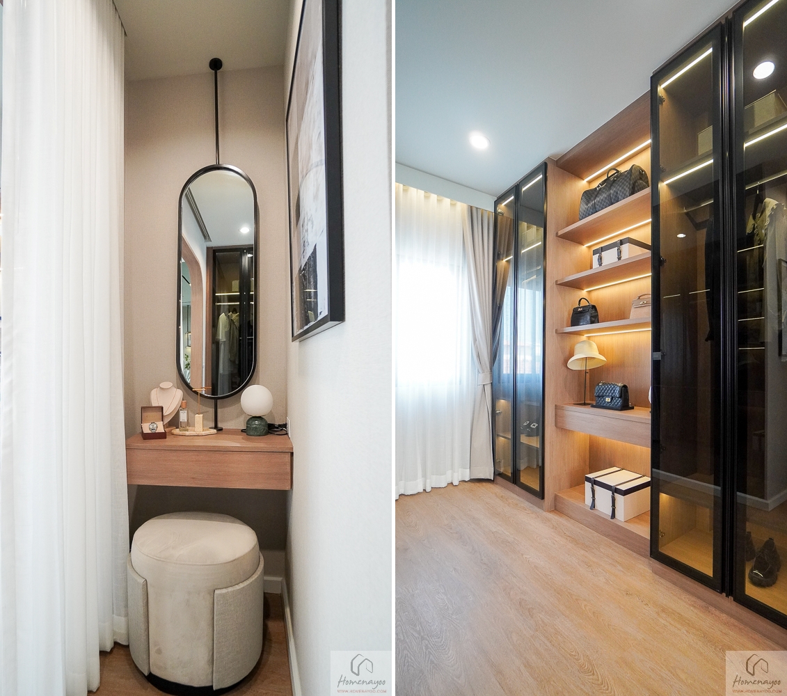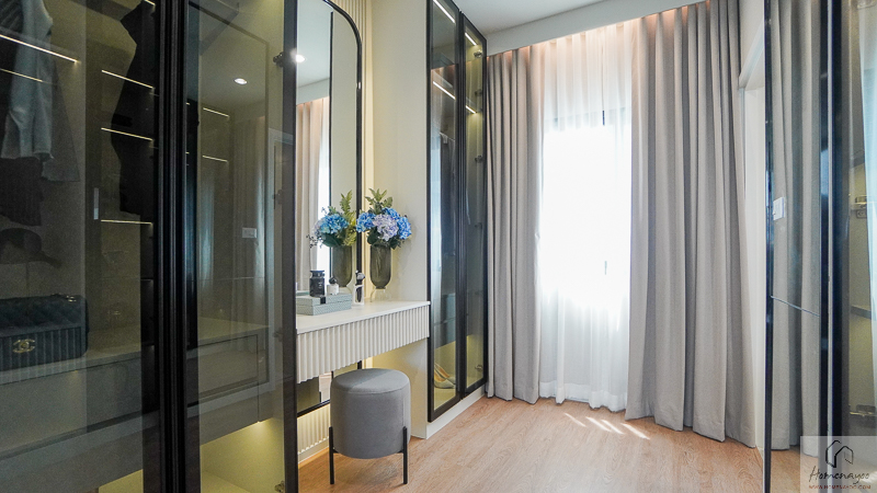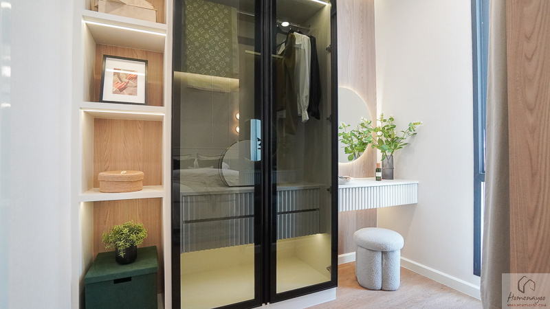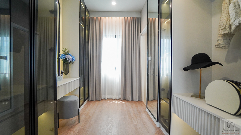 โซน Walk-in Closet สามารถติดตั้งประตูกระจกบานเลื่อนเพื่อกั้นแยกพื้นที่ออกจากส่วนพักผ่อนได้อย่างเป็นสัดส่วน ช่วยเพิ่มความเรียบร้อยและความเป็นส่วนตัวมากขึ้น