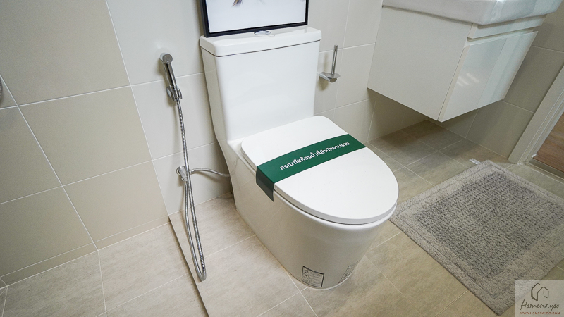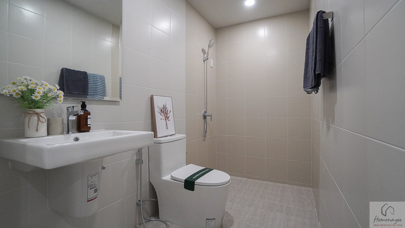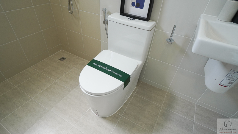 โซนแห้งได้อ่างล้างมือแบบแขวนผนัง กระจกเงา ปลั๊กไฟกันน้ำ ราวแขวนผ้า และโถสุขภัณฑ์ครบ