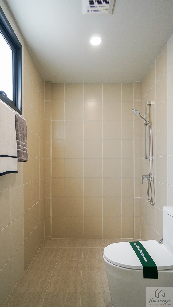 มีการแยกส่วนแห้งกับโซนอาบน้ำออกจากกันชัดเจน สุขภัณฑ์เลือกใช้แบรนด์ Cotto มาตรฐานคุณภาพ พร้อมติดตั้งหน้าต่างกระจกบานกระทุ้งและพัดลมระบายอากาศมาให้ 1 เครื่อง ช่วยถ่ายเทอากาศได้ดี ลดความอับชื้นภายในห้องน้ำค่ะ