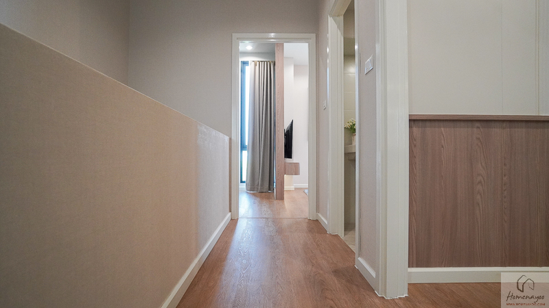 อีกฝั่งของห้องจะมีส่วนของผนังเปล่า และงานระบบไฟฟ้า ไว้สำหรับติด Smart TV และติดกันจะเป็นประตูทางเข้าสู่ห้องน้ำในตัวค่ะ
