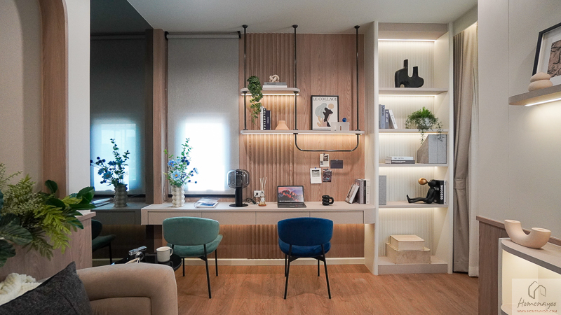 หน้าบ้านเป็นพื้นที่อเนกประสงค์ ที่โครงการตกแต่งเป็นห้องทำงานแบบส่วนตัวมาให้ดูเป็นไอเดีย ส่วนบ้านจริงเลิกปรับเปลี่ยนฟังก์ชันได้หลากหลายตามไลฟ์สไตล์