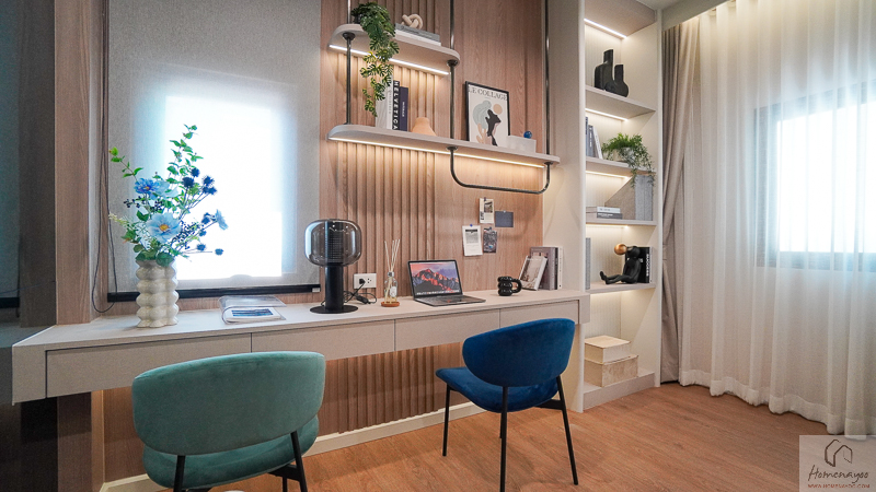ด้านหลังห้องออกแบบเป็นพื้นที่แนวยาว ใช้งานได้ยืดหยุ่น สามารถจัดเป็นมุมทำงานแบบ 2 ที่นั่ง และยังมีพื้นที่เหลือให้วางตู้เก็บของ ชั้นวางเอกสารเพิ่มได้ด้วย