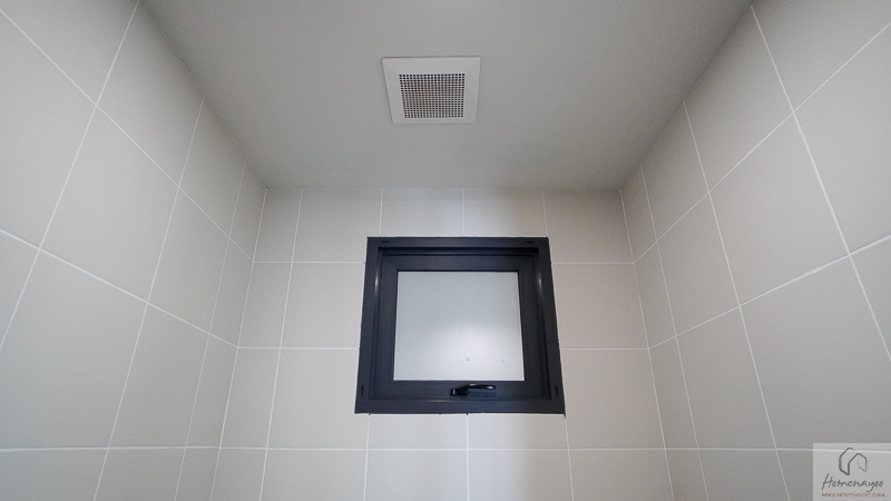 ในห้องน้ำมีตัวช่วยระบายอากาศให้ 2 แบบ คือพัดลมระบายอากาศแบบฝังเพดาน และหน้าต่างกระจกฝ้าบานกระทุ้งติดไว้ด้านหลังบ้าน 1 บาน