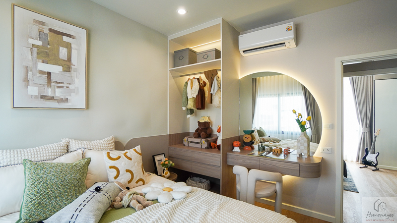บ้านตัวอย่างตกแต่งเป็นห้องนอนเด็กมาให้ดูเป็นไอเดียค่ะ รองรับการวางเตียงนอน 3.5-5 ฟุต หรือจะวางเป็นเตียงนอน 2 ชั้น ในกรณีที่มีลูกวัยไล่เลี่ยกันได้
