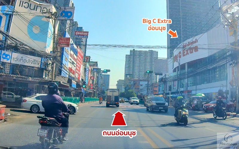 เลี้ยวเข้ามาบนถนนอ่อนนุช ช่วงต้น ๆ ซอยนี้ จะมีร้านค้า ร้านอาหาร ตลาดอ่อนนุช และ Big C Extra อ่อนนุช เปิดอยู่