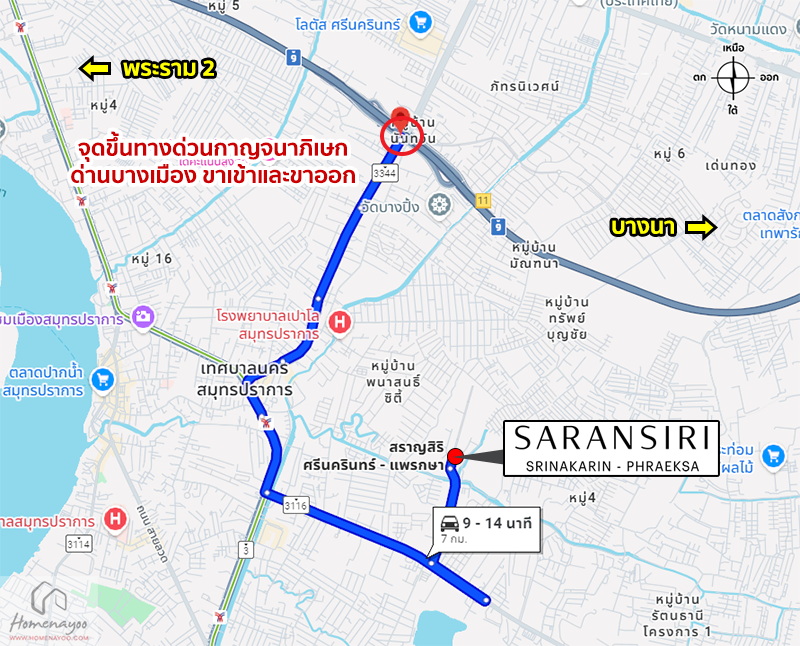 จากถนนแพรกษาเลี้ยวเข้าซอยมาตรง ๆ ประมาณ 1 กม.* ก็จะถึงตัวโครงการ โดยตลอดเส้นทางปัจจุบันมีแบรนด์ที่เปิดขายแล้ว 2 โครงการ ได้แก่ “สราญสิริ” และ “อณาสิริ” ถัดลึกเข้าไปอีกหน่อยจะเป็นพื้นที่พัฒนาในอนาคตของแสนสิริ ที่เตรียมเปิดตัวเพิ่มอีก 2 แบรนด์