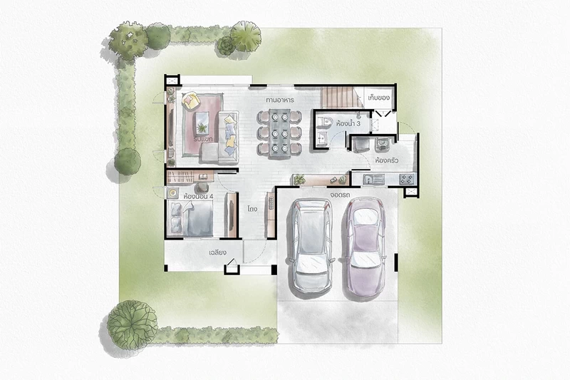 หน้าบ้านจอดรถยนต์ในร่มได้ 2 คัน และที่จอดรถทั้งหมดจะเทพื้นคอนกรีตทรายล้างมาให้ โดยโครงสร้างด้านในจะเป็นแบบ On Beam ลงเสามาให้ลึกเท่าตัวบ้าน และด้านนอกจะเป็นแบบ On Ground ตัด Joint มาให้เรียบร้อย