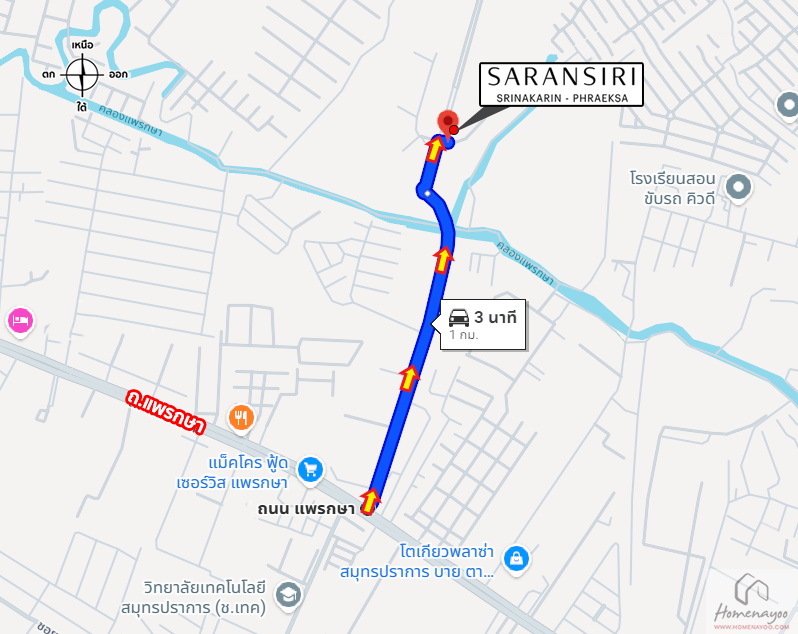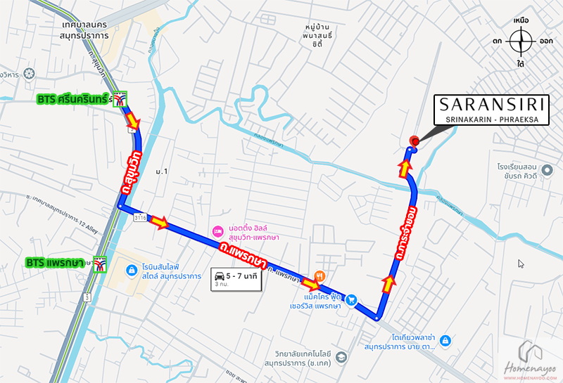จากถนนแพรกษาเลี้ยวเข้าซอยมาตรง ๆ ประมาณ 1 กม.* ก็จะถึงตัวโครงการ โดยตลอดเส้นทางปัจจุบันมีแบรนด์ที่เปิดขายแล้ว 2 โครงการ ได้แก่ “สราญสิริ” และ “อณาสิริ” ถัดลึกเข้าไปอีกหน่อยจะเป็นพื้นที่พัฒนาในอนาคตของแสนสิริ ที่เตรียมเปิดตัวเพิ่มอีก 2 แบรนด์