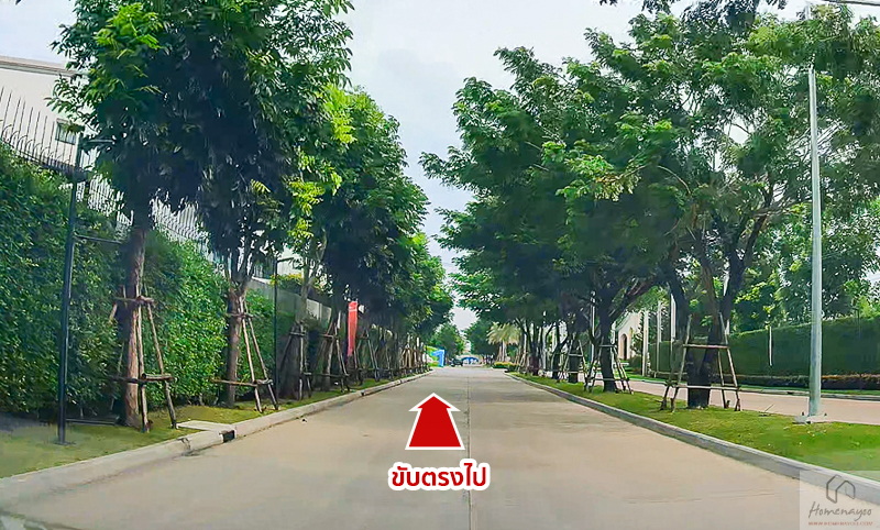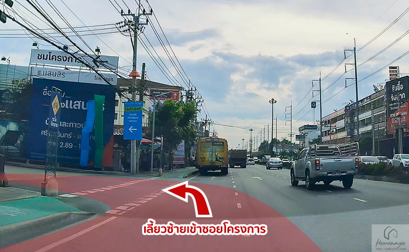 ตรงมาจนเจอกับ The Blue Arena แล้วให้เราเลี้ยวซ้ายเข้าซอยด้านหน้าได้เลย หน้าปากซอยจะมีป้ายบิลบอร์ดเข้าชมโครงการติดอยู่