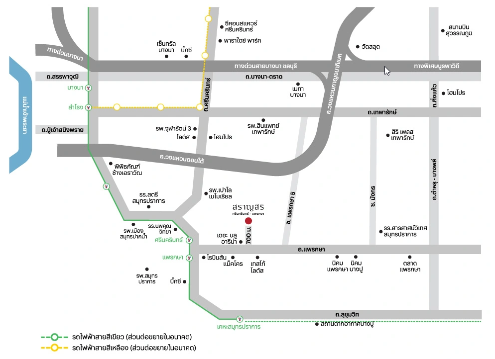 ⇒ ทำเลที่ตั้งโครงการ : สราญสิริ ศรีนครินทร์-แพรกษา ตั้งอยู่ในบรรยากาศที่ผสมความสงบของชุมชนเมืองเข้ากับความสะดวกสบายในชีวิตประจำวันได้อย่างลงตัว ทำเลบริเวณแพรกษาเป็นโซนที่มีความอุดมสมบูรณ์ครบทั้งซูเปอร์มาร์เก็ต ร้านอาหาร และแหล่งจับจ่าย ซึ่งใช้เวลาขับรถไม่กี่นาทีถึงสถานที่สำคัญหลายแห่ง