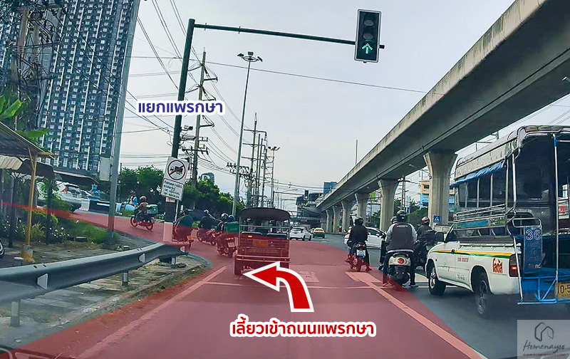 ผ่านสถานีรถไฟฟ้า ศรีนครินทร์มาแล้ว ให้ชิดซ้ายเพื่อเตรียมเลี้ยวเข้าสู่ถนนแพรกษา