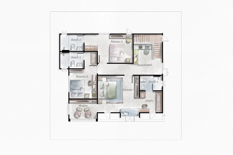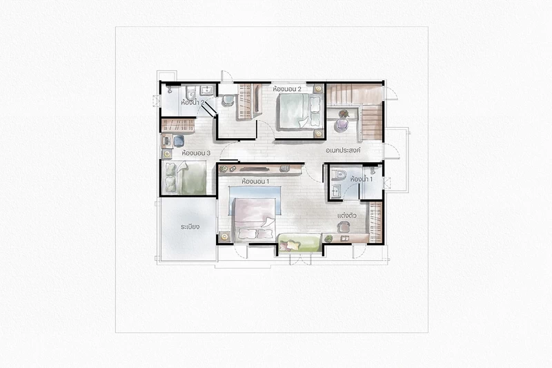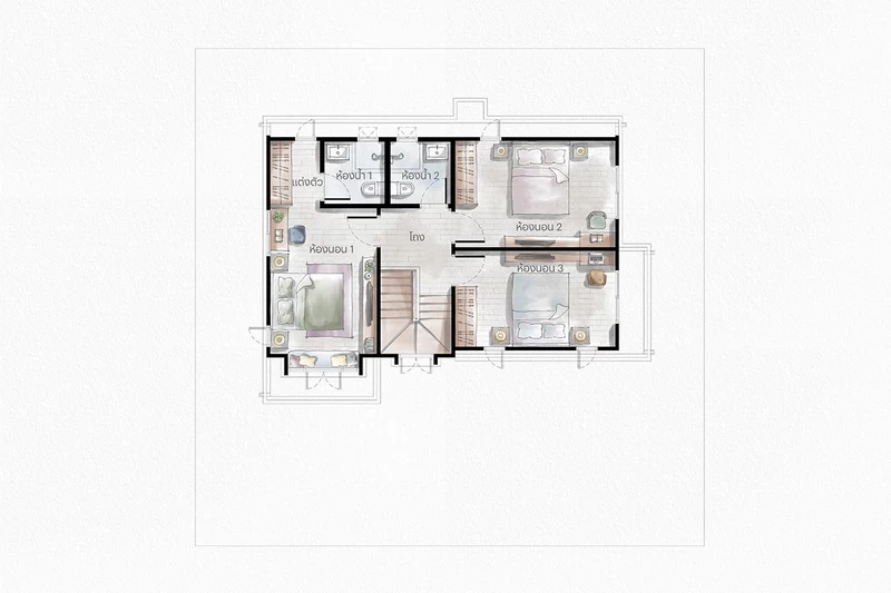 แปลนบ้านชั้น 2 ขึ้นมาด้านบนจะเจอกับโถงทางเดินแนวยาว ติดกับบันไดจะมีพื้นที่อเนกประสงค์ให้จัดฟังก์ชันการใช้งานได้ตามใจชอบ หน้าบ้านจะเป็นห้องนอนใหญ่ ที่ได้พื้นที่เต็มความกว้างหน้าบ้าน พร้อมฟังก์ชันของ Walk-in Closet ห้องน้ำในตัว และระเบียงส่วนตัว ถัดไปที่หลังบ้าน จะเป็นห้องนอน 2 และห้องนอน 3 ที่มีขนาดใกล้เคียงกัน และสามารถใช้ห้องน้ำร่มกันได้ผ่านตรงกลางของทั้ง 2 ห้องค่ะ