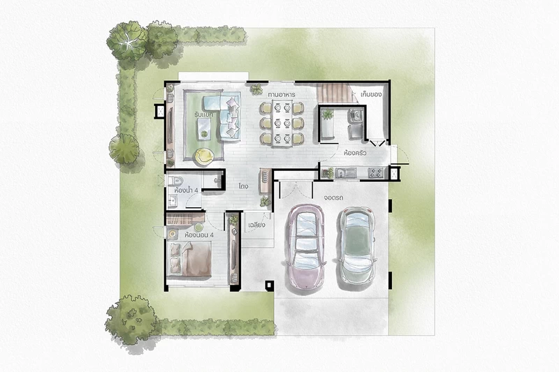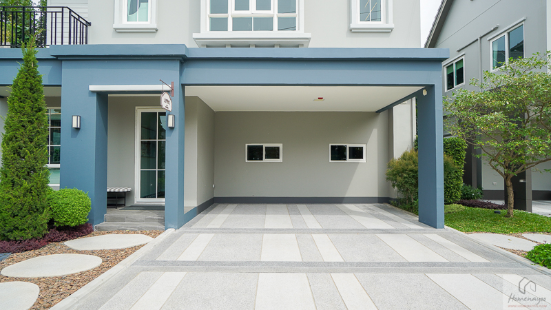 หน้าบ้านจอดรถยนต์ในร่มได้ 2 คัน และที่จอดรถทั้งหมดจะเทพื้นคอนกรีตทรายล้างมาให้ โดยโครงสร้างด้านในจะเป็นแบบ On Beam ลงเสามาให้ลึกเท่าตัวบ้าน และด้านนอกจะเป็นแบบ On Ground ตัด Joint มาให้เรียบร้อย