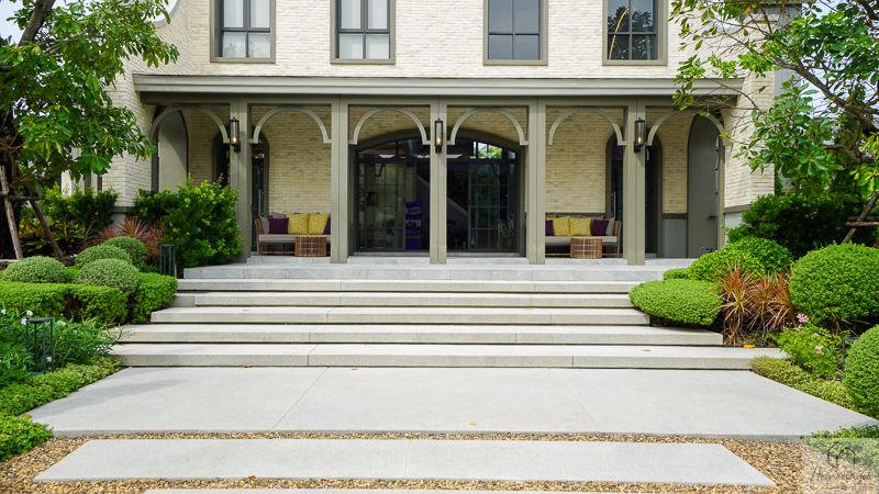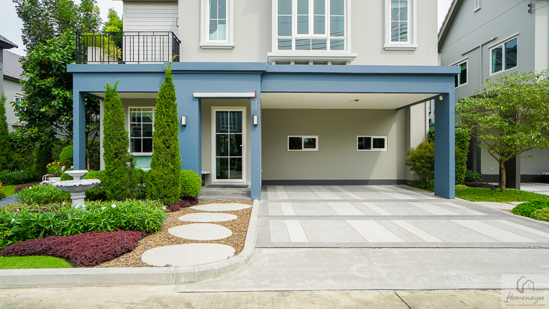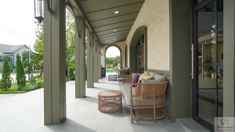จากที่จอดรถจะเดินเชื่อมต่อมายังเฉลียงหน้าบ้านได้เลย และที่เสาหน้าบ้านจะติดโคมไฟกิ่งมาให้ด้วย 1 คู่