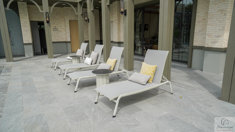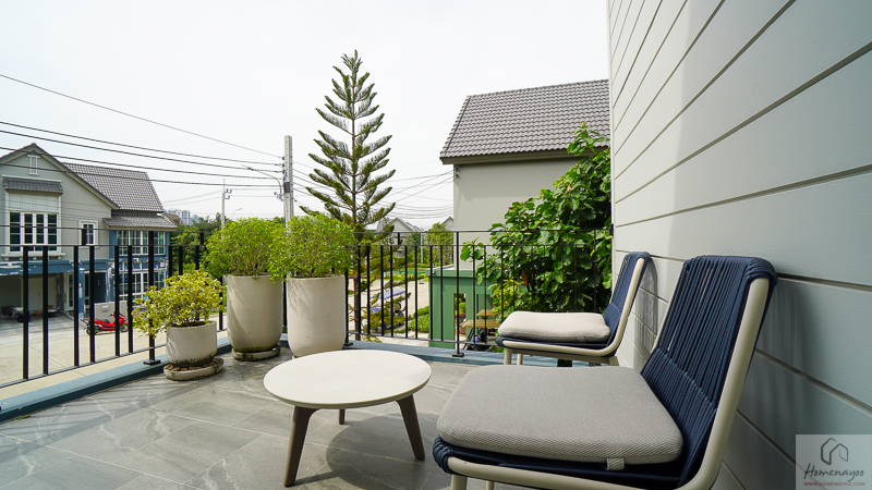 ระเบียงด้านนอกได้พื้นที่มากว้างดีมาก ๆ มีการปูพื้นกระเบื้องลายหิน ติดราวกันตกมาให้เรียบร้อย เราสามารถวางชุดโต๊ะน้ำชา ไว้ออกมานั่งเล่น กินกาแฟในตอนเช้า ๆ หรือใช้เป็นมุมนั่งเล่นรับลมชมวิว นั่งอ่านหนังสือในตอนเย็น ๆ ได้