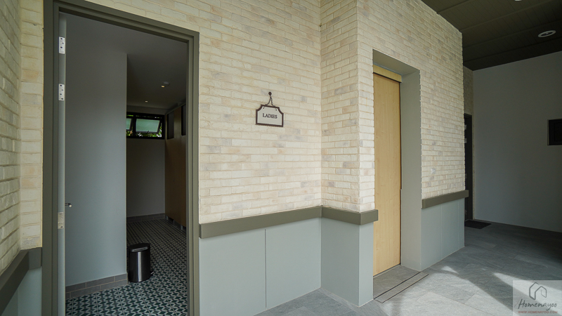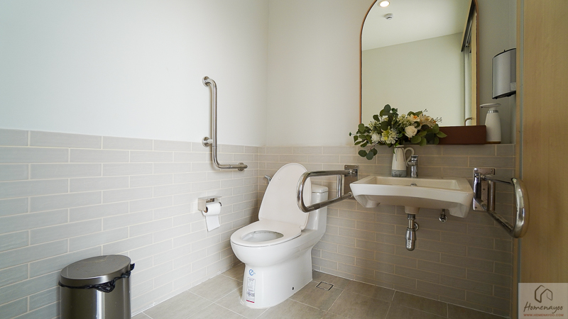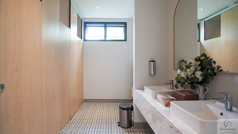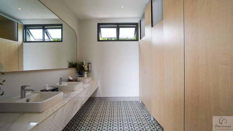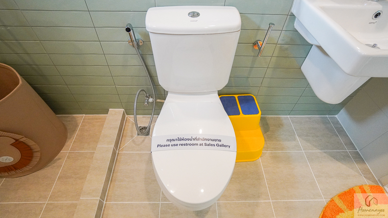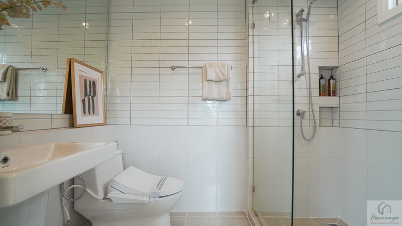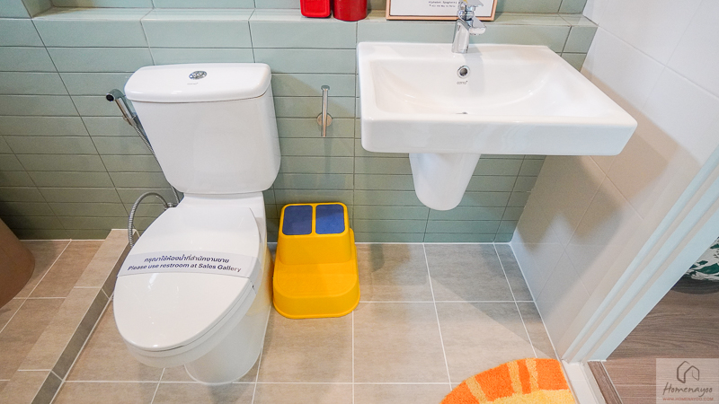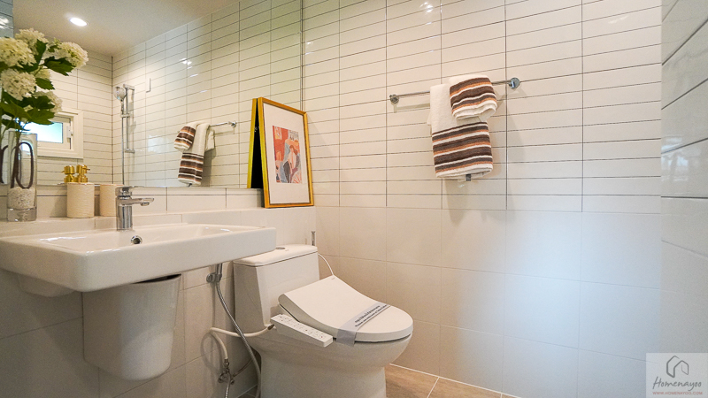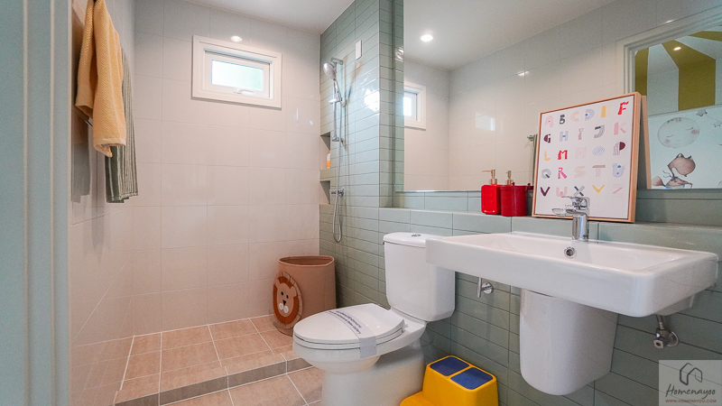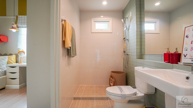 ไปต่อกันที่ห้องน้ำชั้นล่าง ภายในจะมีการแบ่งส่วนแห้งแยกส่วนอาบน้ำ และติดสุขภัณฑ์ของ Cotto มาให้พร้อมใช้งาน พร้อมตกแต่งกระเบื้องพื้นและผนังในโทนสีเขียวอ่อน สีขาว และสีเทา ที่ดูสว่างและอ่อนหวานดีมาก ๆ
