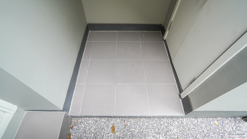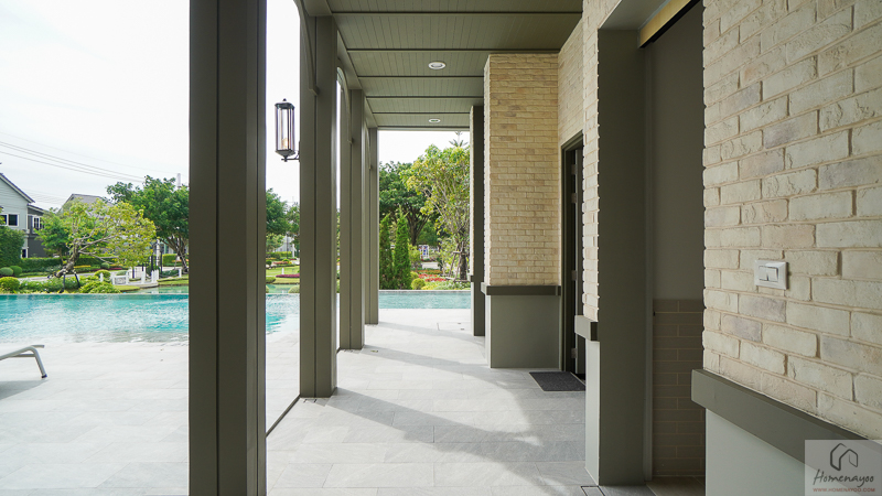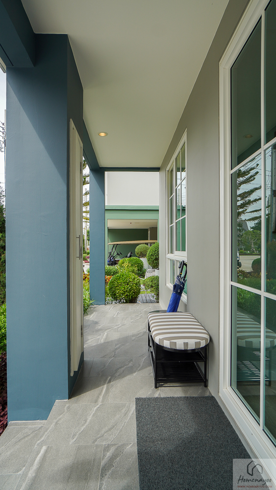 เฉลียงในร่มพื้นที่กว้าง ปูพื้นกระเบื้องลายหินสีเทาให้เต็มพื้นที่ ช่วยให้กวาดถูทำความสะอาดได้ง่าย ตรงเวาหน้าบ้านมีตู้เก็บของให้ 1 ตู้ และตัวเฉลียงจะมีพื้นที่ว่างให้วางม้านั่งใส่รองเท้า ตู้เก็บรองเท้า ตะกร้าใส่ร่ม หรือจัดสวนต้นไม้กระถางเพิ่มได้