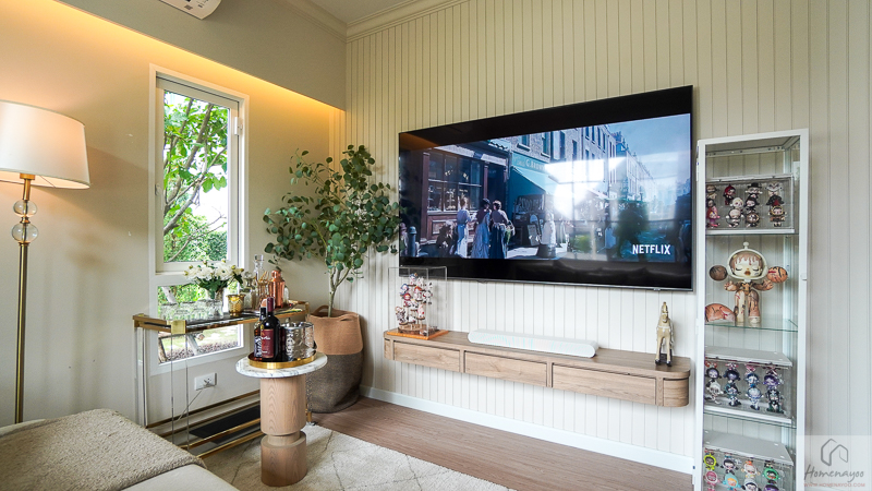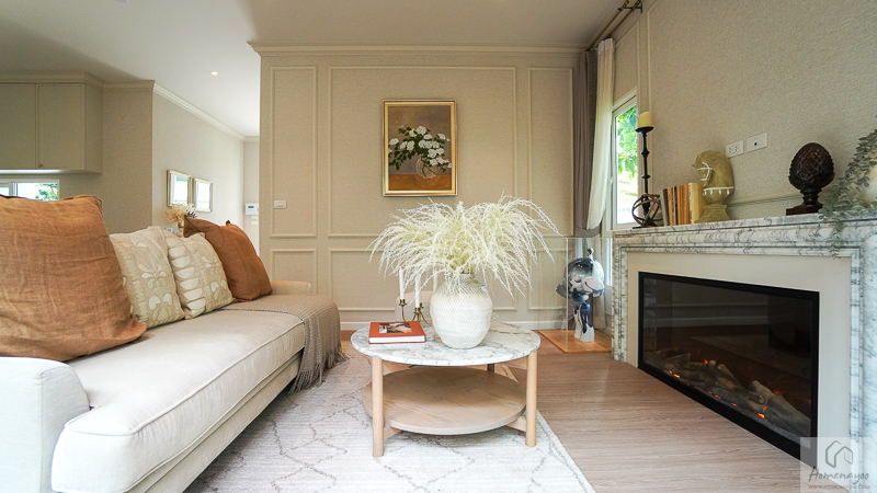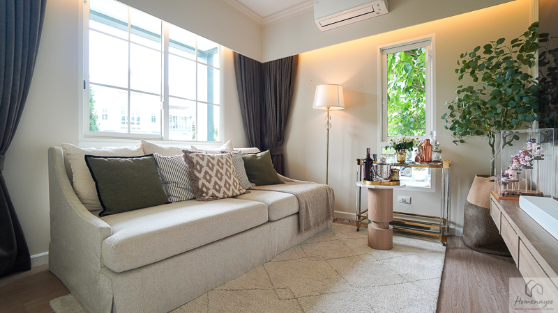 รองรับโซฟาขนาด 3-5 ที่นั่ง พร้อมโต๊ะกลางด้านหน้า และฝั่งตรงข้ามก็สามารถวางชั้นวางทีวีขนาดใหญ่ ติด Smart TV จอใหญ่ที่ผนัง หรือจะ Built-in ตู้โชว์แบบ Full Set เลยก็ได้ค่ะ