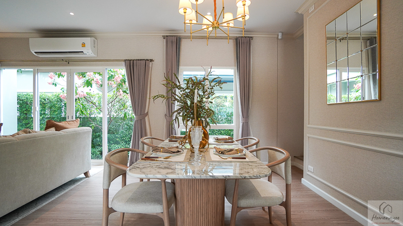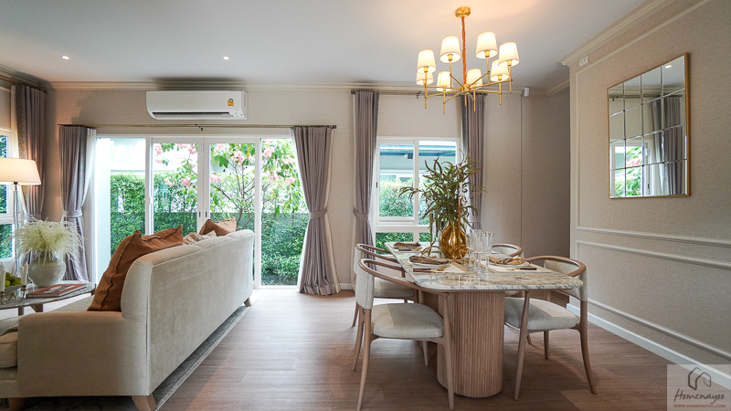 ถัดเข้าไปด้านในจะเจอกับ Common Area แบบ Open Plan ที่สามารถรวมห้องนั่งเล่นและมุมทานอาหารไว้ด้วยกันได้ลงตัว และทั้ง 2 มุม จะเปิดรับวิวสวนหลังบ้านผ่านหน้าต่าง-ประตูกระจกบานใหญ่ได้ ถัดไปทางขวาสุด จะเป็นพื้นที่ของห้องน้ำชั้นล่าง และ Pantry เชื่อมกับห้องครัวปิด ที่มีประตูอีกบานให้เปิดออกไปลานซักล้างได้อีกทีค่ะ